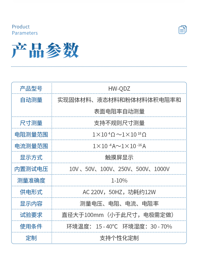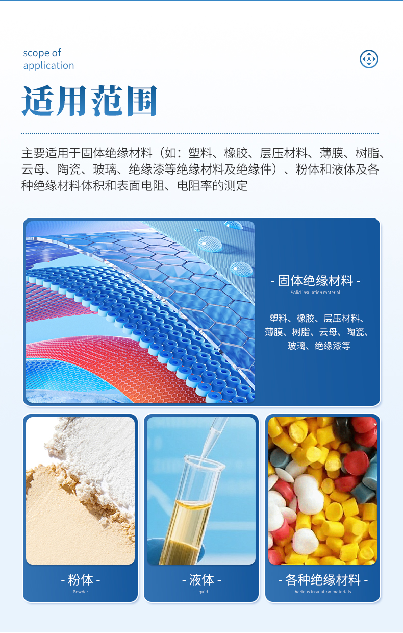 主要适用于固体绝缘材料(如:塑料、橡胶、层压材料、薄膜、树脂、云母、陶瓷、玻璃、绝缘漆等绝缘材料及绝缘件)、粉体和液体及各种绝缘材料体积和表面电阻、电阻率的测定。