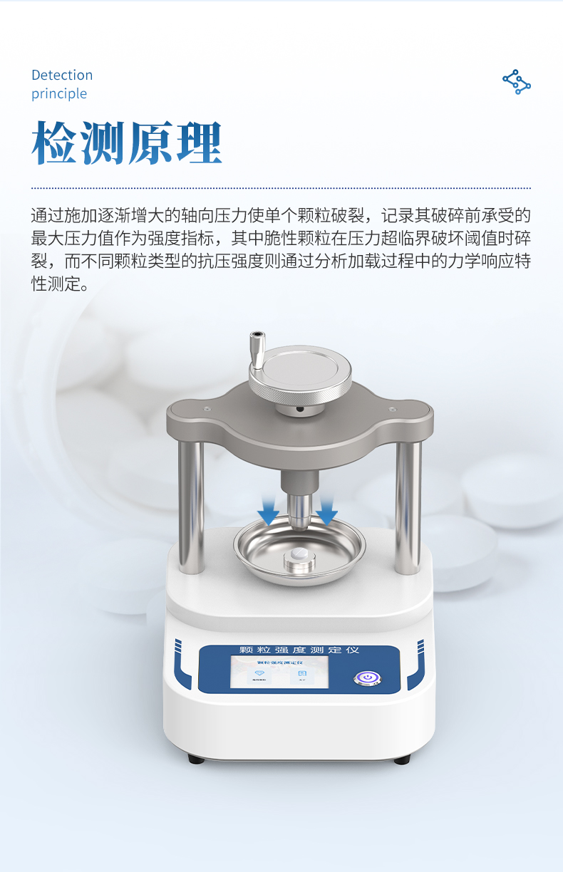 颗粒强度检测通过施加逐渐增大的轴向压力使单个颗粒破裂,记录其破碎前承受的最大压力值作为强度指标,其中脆性颗粒在压力超临界破坏阈值时碎裂,而不同颗粒类型的抗压强度则通过分析加载过程中的力学响应特性测定。
