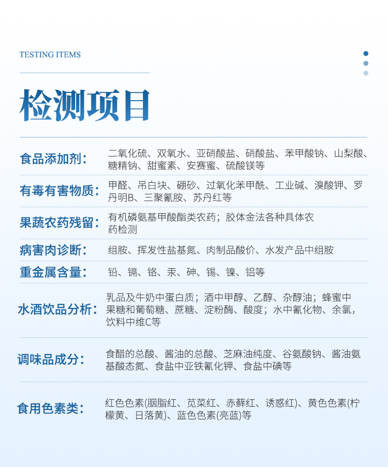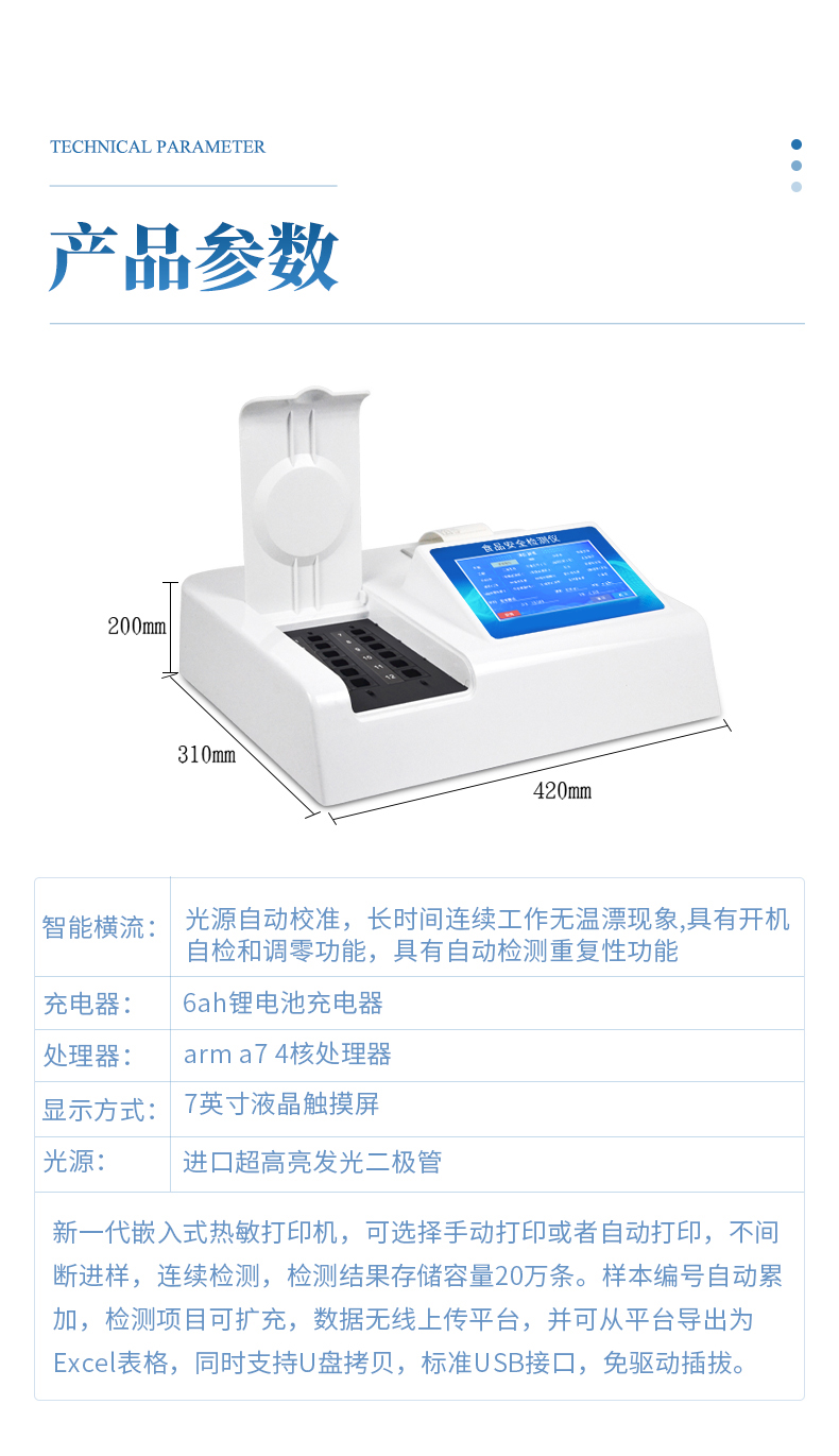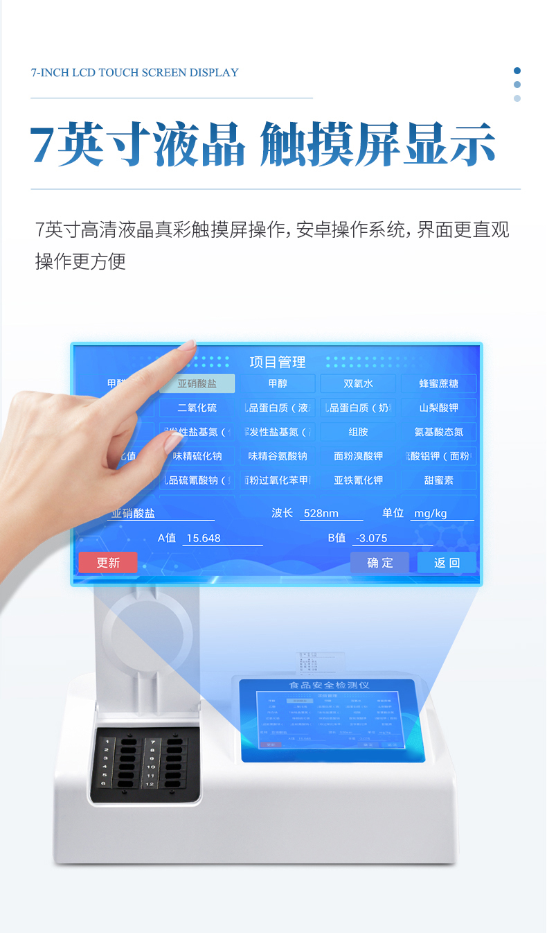 可快速检测各类食品中的甲醛、二氧化硫、亚硝酸盐、吊白块、总多酚的含量,仪器预留其他项目检测程序和端口,根据日后需求可方便的自主增加检测项目。