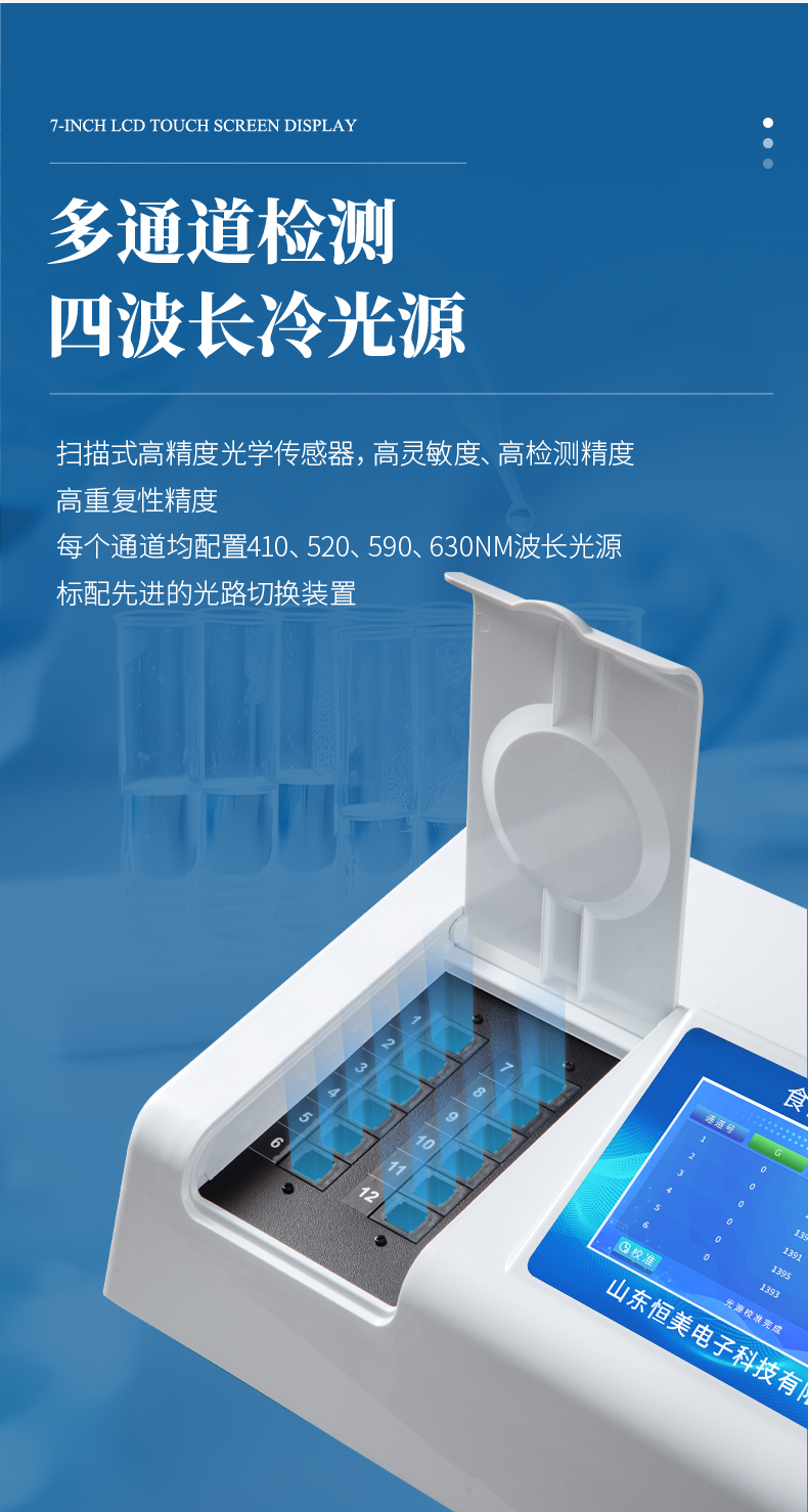 3、四波长冷光源,每个通道均配置410、520、590、630nm波长光源,标配先进的光路切换装置,专利光路切换功能可实现最多64波长,并且所有检测项目可实现所有通道同时检测。