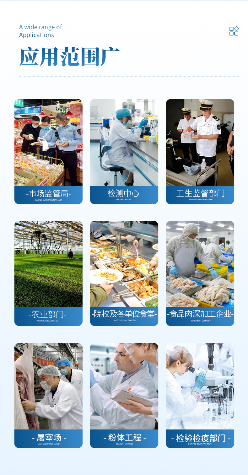 该多功能食品安全检测仪为集成化食品安全快速检测分析设备,广泛应用于食药监局、卫生部门、高教院校、科研院所、农业部门、养殖场、屠宰场、食品肉产品深加工企业、检验检疫部门等单位使用。