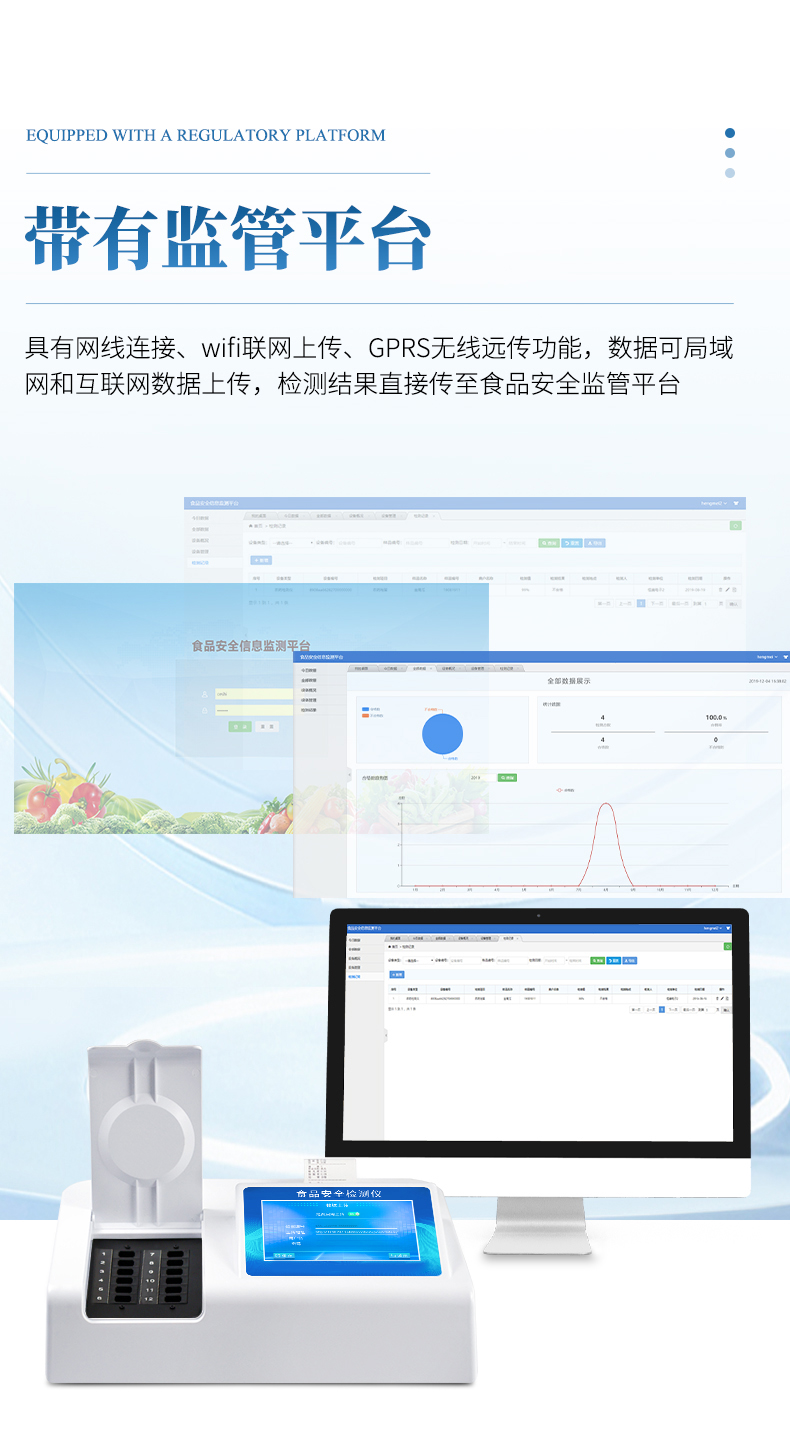 8、仪器带有监管平台。数据可局域网和互联网数据上传,检测结果直接传至食品安全监管平台。进行区域食品安全监管及大数据分析处理,检测区域食品安全长短期动态,达到食品安全问题预估、预警