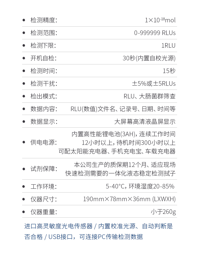 随机配置:ATP荧光检测仪(手持)主机、铝合金手提箱、驱动U盘、PC数据线、数据分析软件、中文操作手册