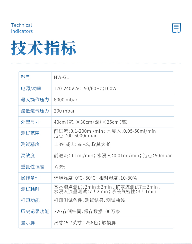 | 测试耗时 | 基本泡点测试:2 min±2min;扩散流测试7±2min; 水浸入流量测试7±2min;系统气密性:3±1min; |