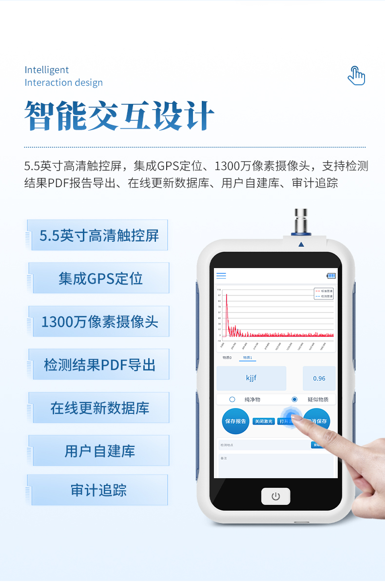 智能交互:高清触控屏,集成GPS定位、高清摄像头,支持检测结果PDF报告导出、在线更新数据库、用户自建库、审计追踪;