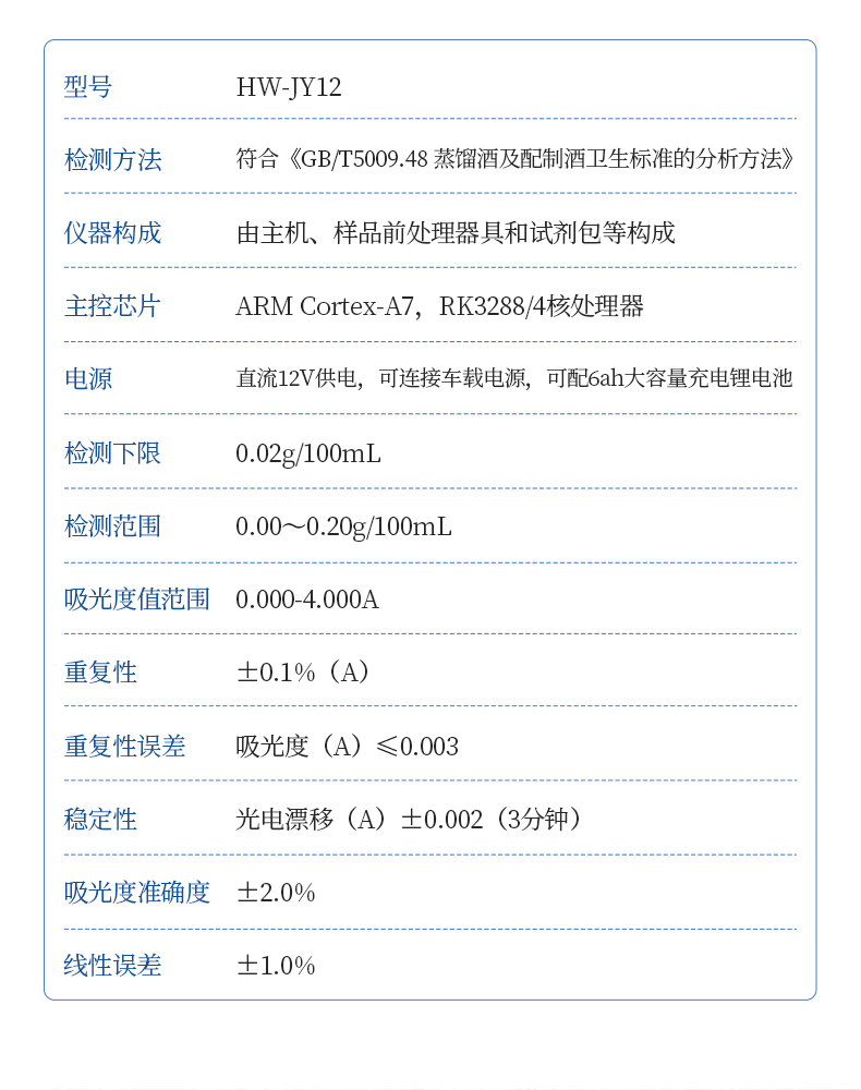 应用范围:用于蒸馏酒、配制酒和发酵酒中甲醇浓度的定量测定。