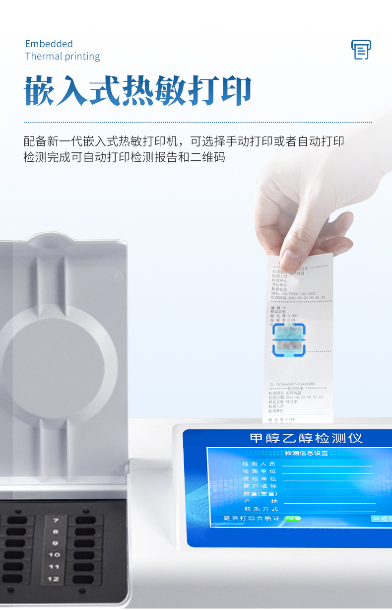 4、配备新一代嵌入式热敏打印机,可选择手动打印或者自动打印,检测完成可自动打印检测报告和二维码。