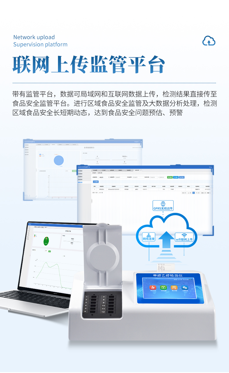 6、仪器带有监管平台。检测结果可直接无线上传。进行数据分析处理,检测酒品等长短期动态,达到问题预估、预警。