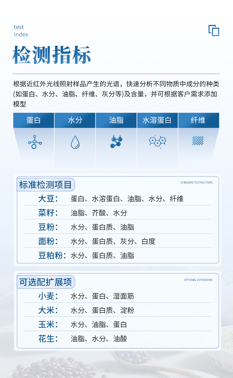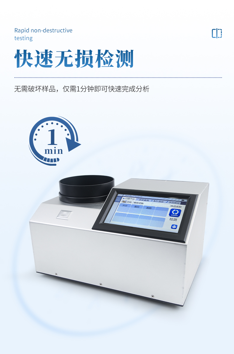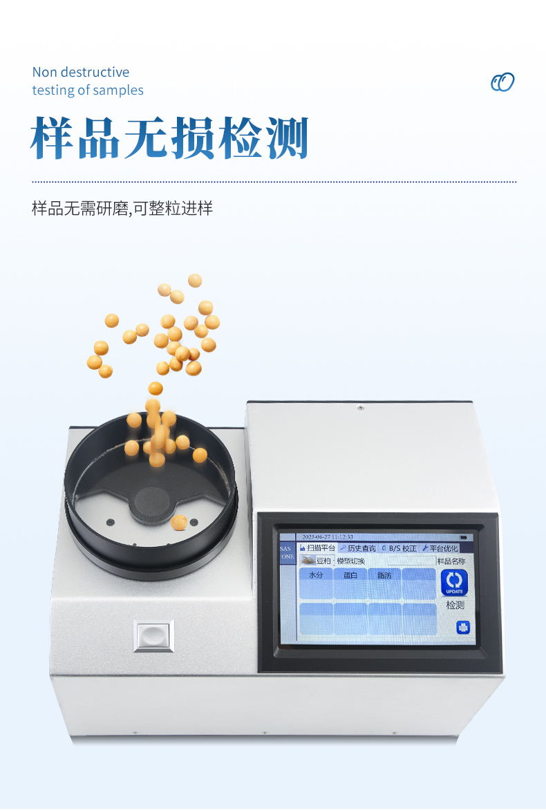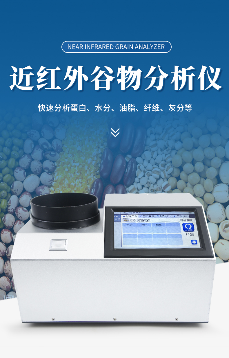 本仪器为近红外光谱分析仪,可以根据近红外光线照射样品产生的光谱,快速分析不同物质中成分的种类(如蛋白、水分、油脂、纤维、灰分等)及含量,并可根据客户需求添加模型。