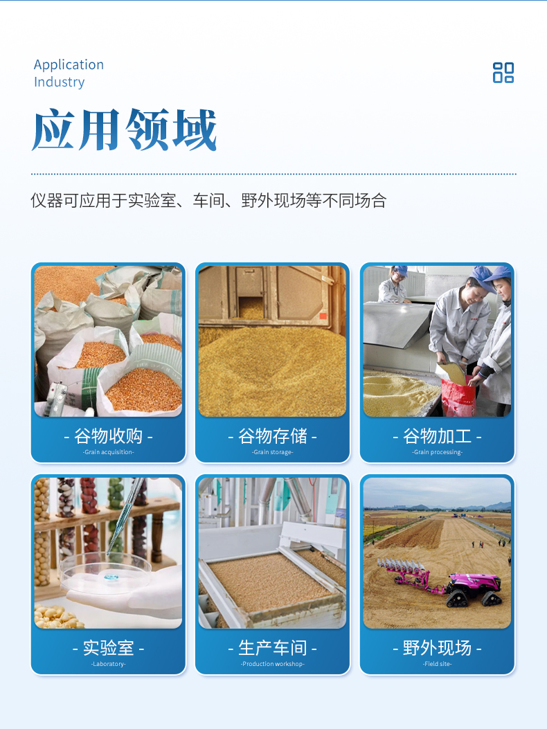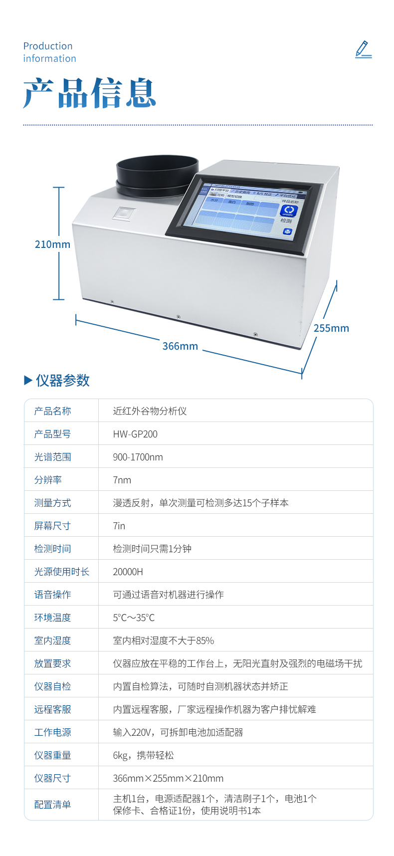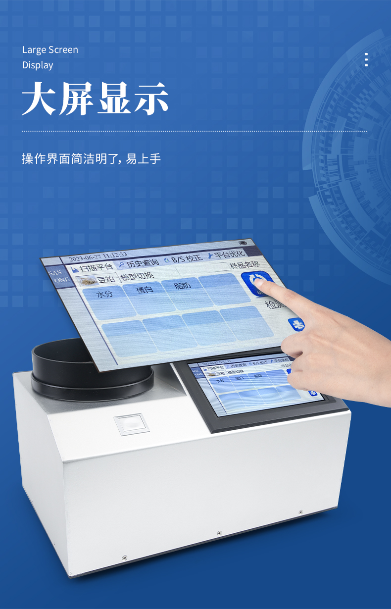 本仪器为近红外光谱分析仪,可以根据近红外光线照射样品产生的光谱,快速分析不同物质中成分的种类(如蛋白、水分、油脂、纤维、灰分等)及含量,并可根据客户需求添加模型。
