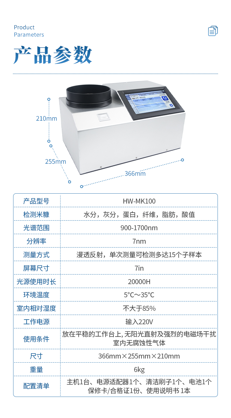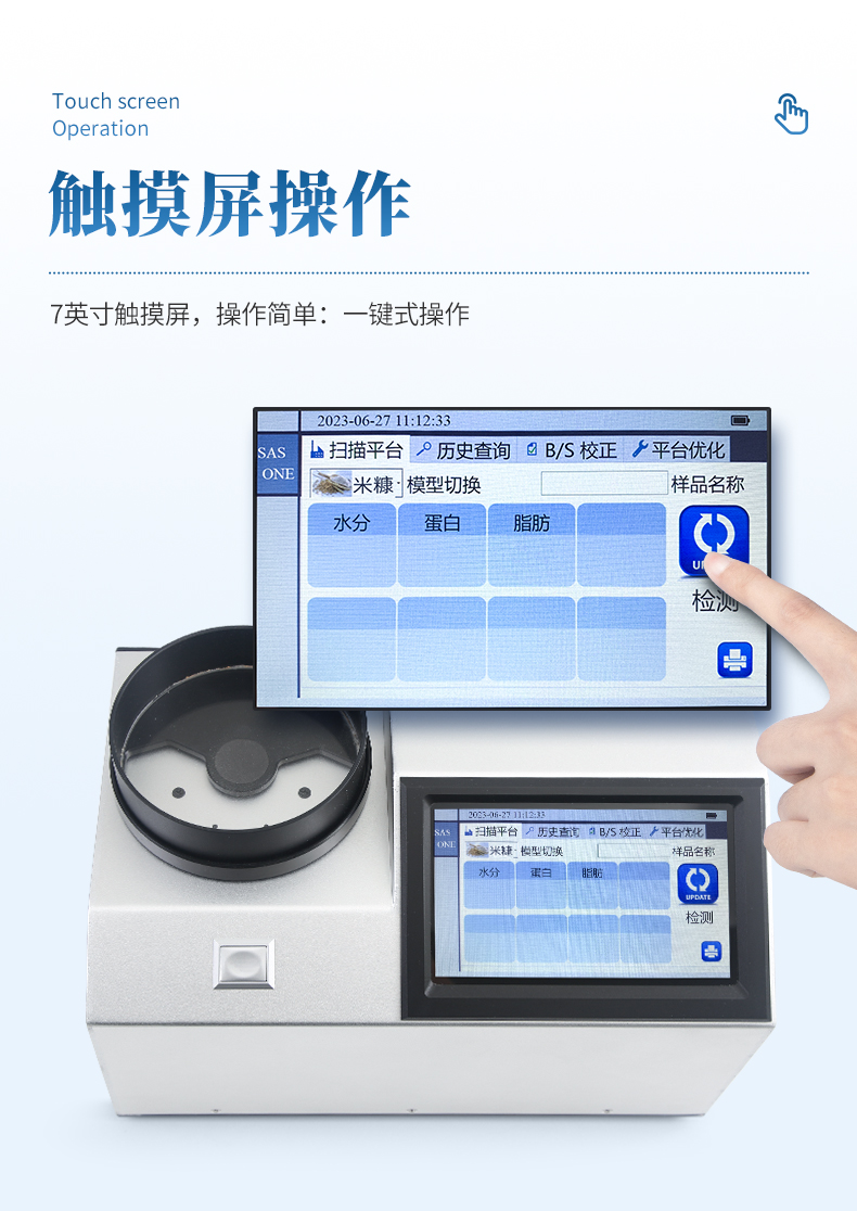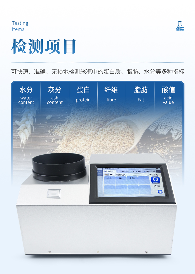 米糠分析仪是针对谷物检测分析开发的分析仪器,可快速、准确、无损地检测样本的蛋白质、脂肪、水分等多种指标,仪器体积小、重量轻,可方便地携带仓储车间以及卡车内进行谷物的检测分析。