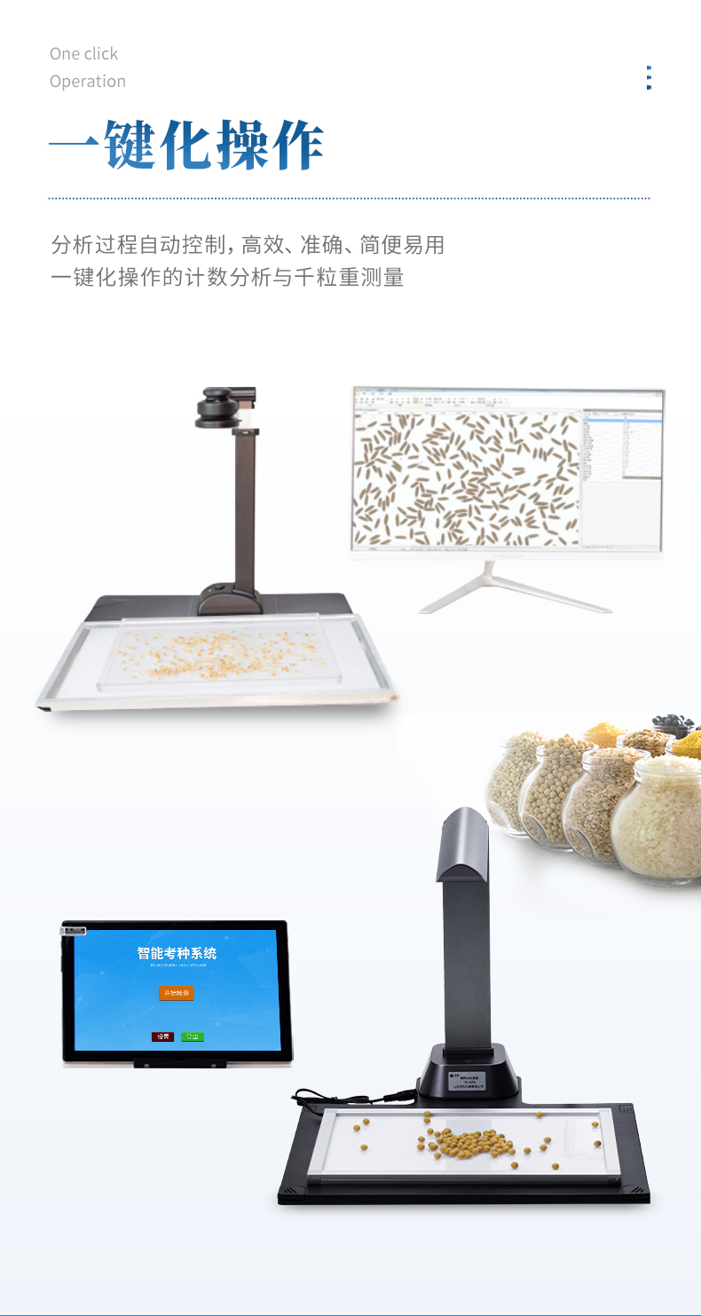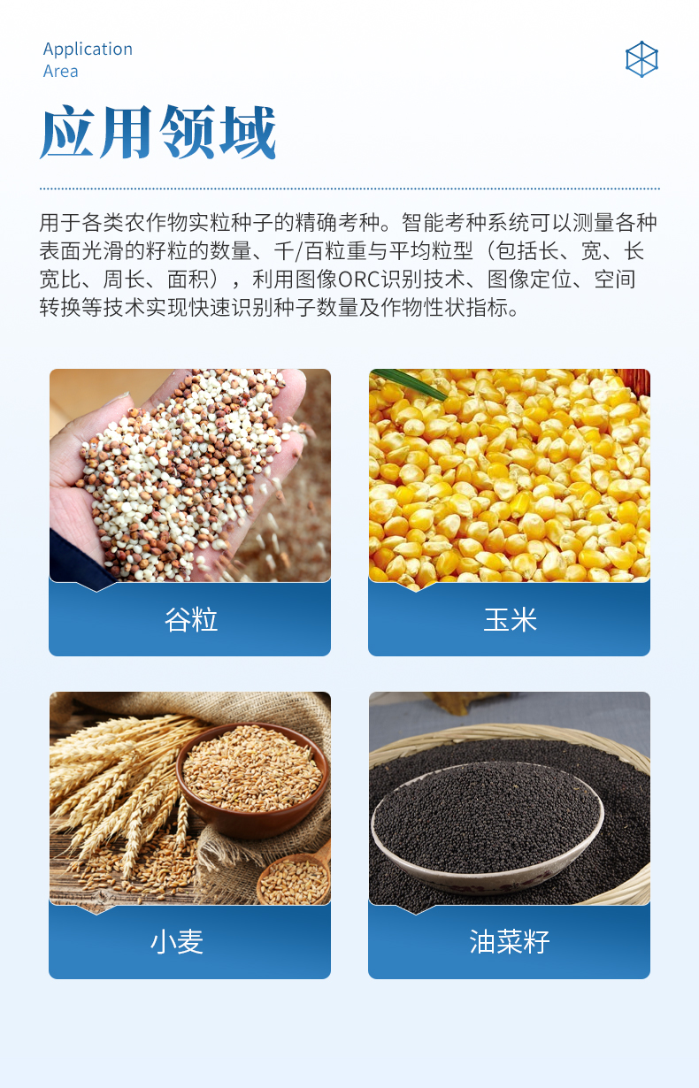 智能考种系统可以测量各种表面光滑的籽粒的数量、千/百粒重与平均粒型(包括长、宽、长宽比、周长、面积),利用图像ORC 识别技术、图像定位、空间转换等技术实现快速识别种子数量及作物性状指标。