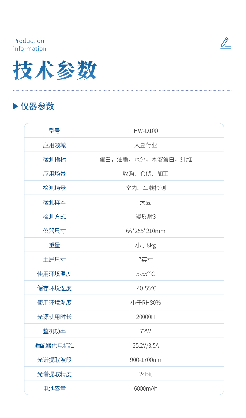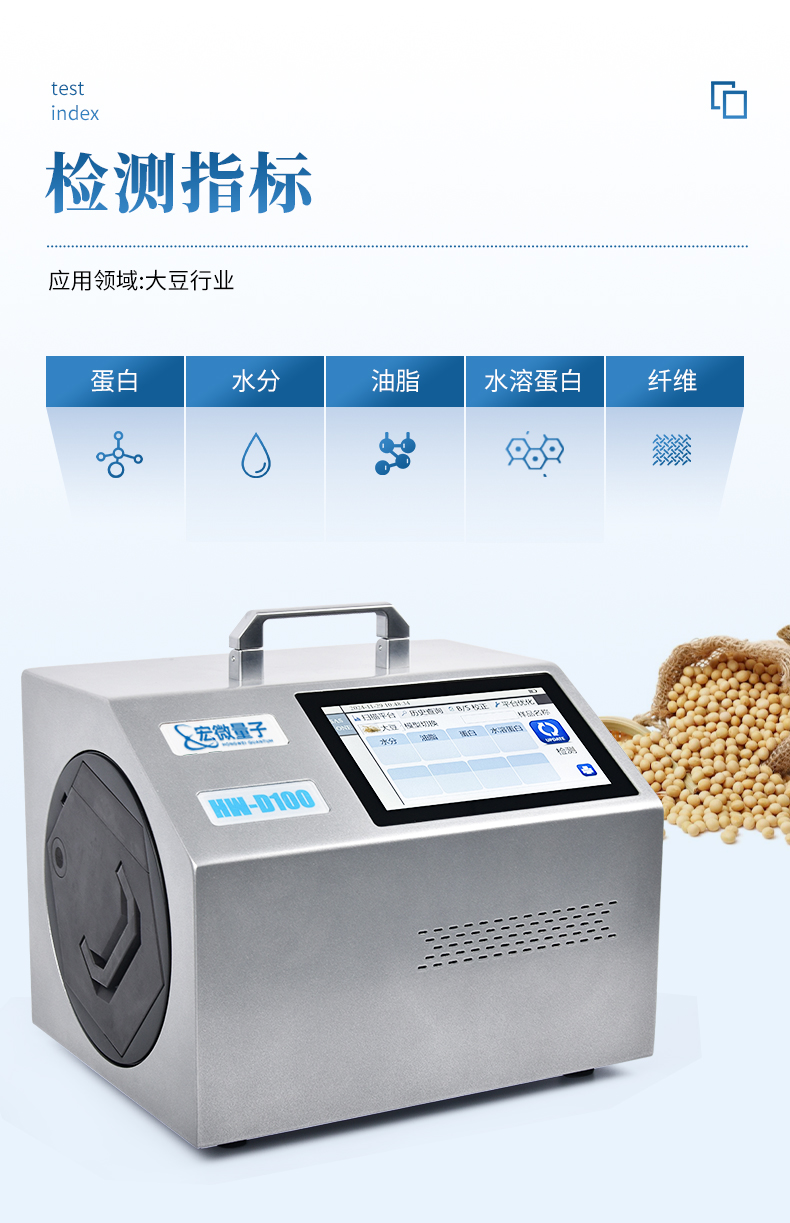 便携式大豆蛋白仪可适用于大豆的收购、储存、加工等多个环节的快速、无损、多指标定量检测分析,为大豆品质鉴定提供快速检测方法。仪器可应用于实验室、车间、野外现场等不同场合。