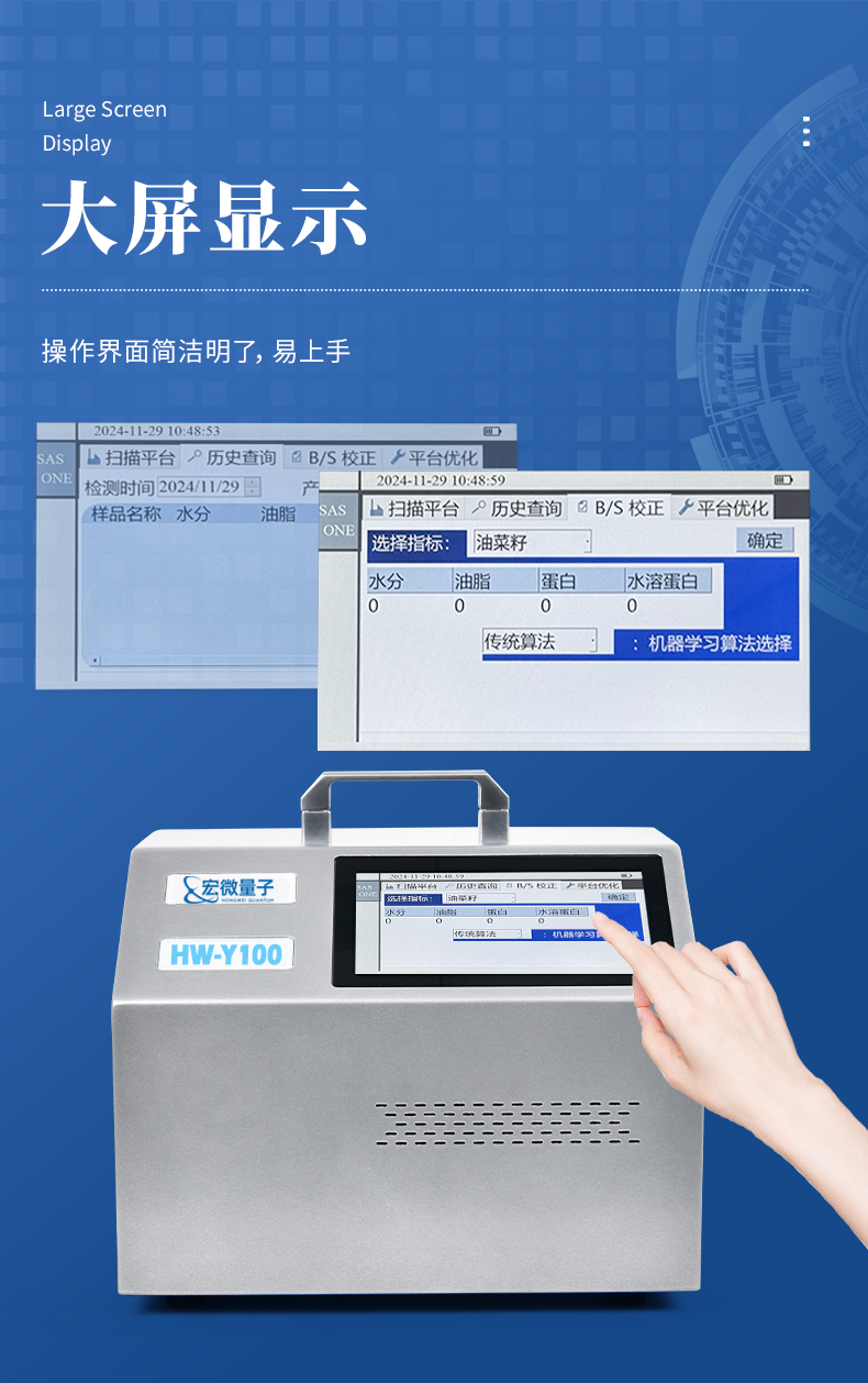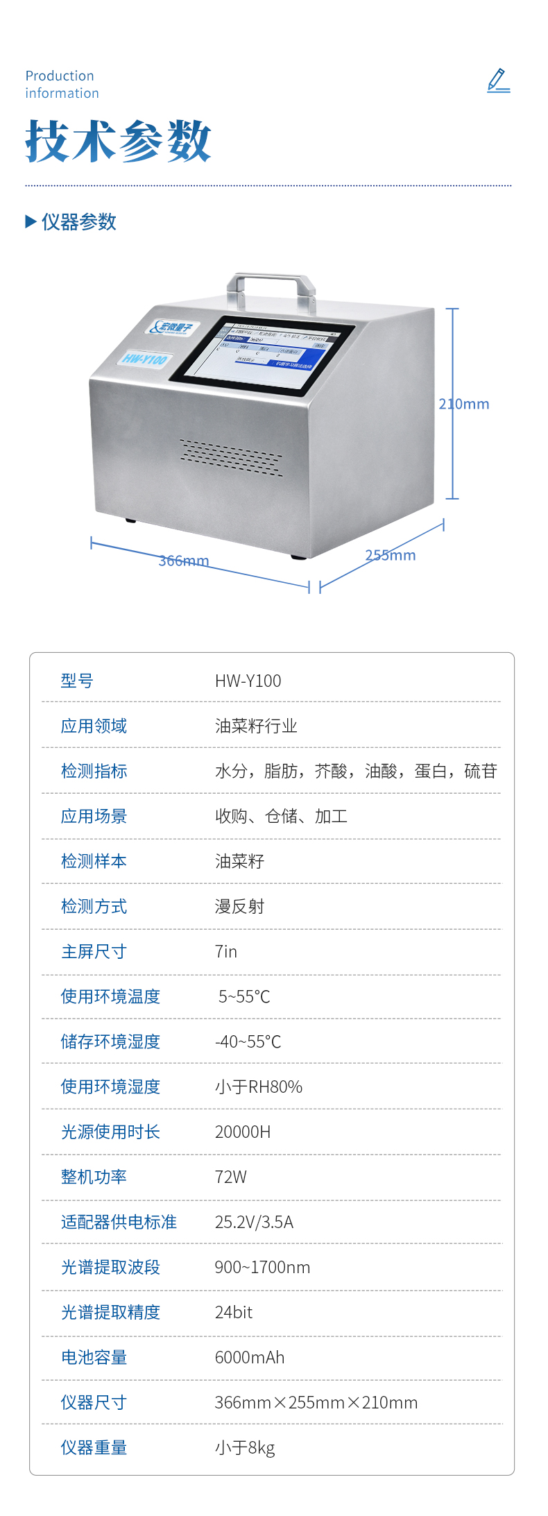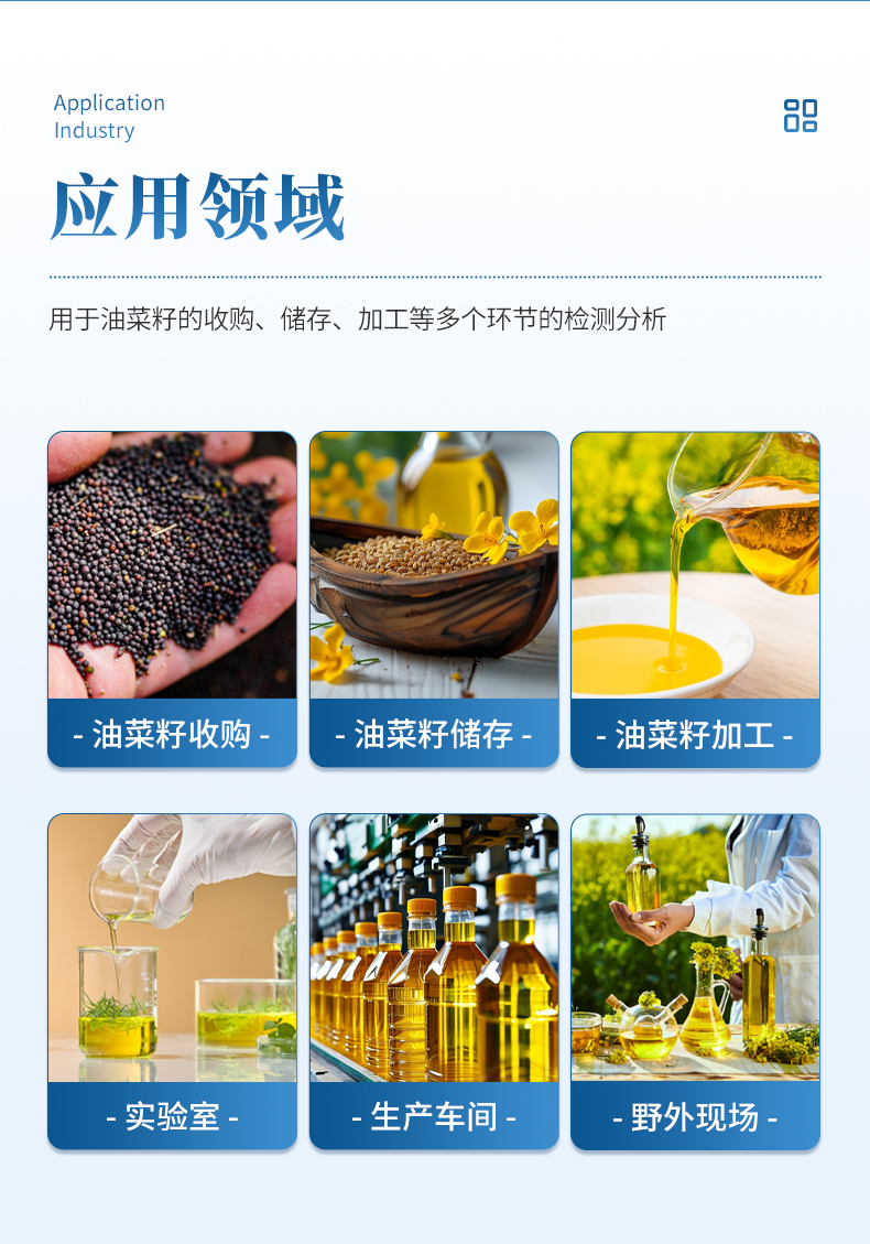 便携式油菜籽分析仪可适用于油菜籽的收购、储存、加工等多个环节的快速、无损、多指标定量检测分析,为油菜籽品质鉴定提供快速检测方法。仪器可应用于实验室、车间、野外现场等不同场合。