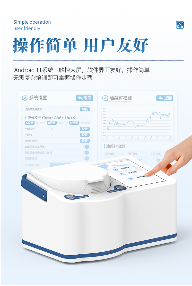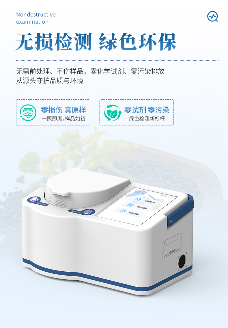 便携式近红外油菜籽分析仪采用近红外光谱技术,可同时无损检测油菜籽中的蛋白质、脂肪、水分和芥酸等指标。分析过程无需复杂前处理,数十秒内即可得出结果,极大提升了检测效率,降低了时间和人力成本。该仪器操作智能简便,是粮油加工、食品检测、育种研发和贸易收购等领域进行原料验收、过程控制与品质评定的理想工具。