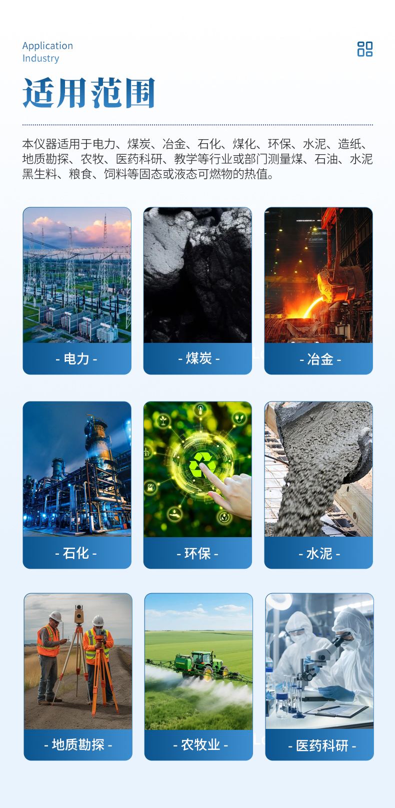 本仪器适用于电力、煤炭、冶金、石化、煤化、环保、水泥、造纸、地质勘探、农牧、医药科研、教学等行业或部门测量煤、石油、水泥黑生料、粮食、饲