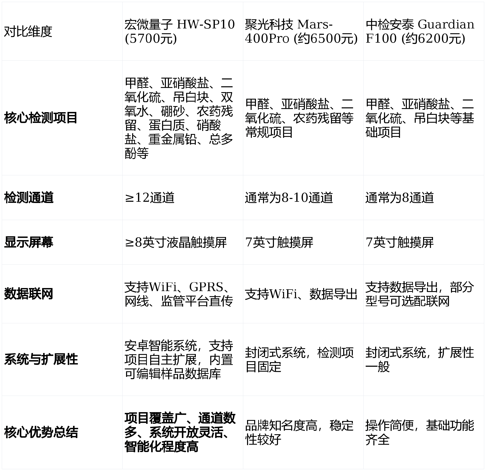 进阶级:HW-SP08(5580元)/HW-SP10(5700元)覆盖了大多数常见的有毒有害物质、添加剂及营养成分检测,其功能配置(12通道、8寸屏、全联网)在参照品牌同价位产品中具备竞争力。