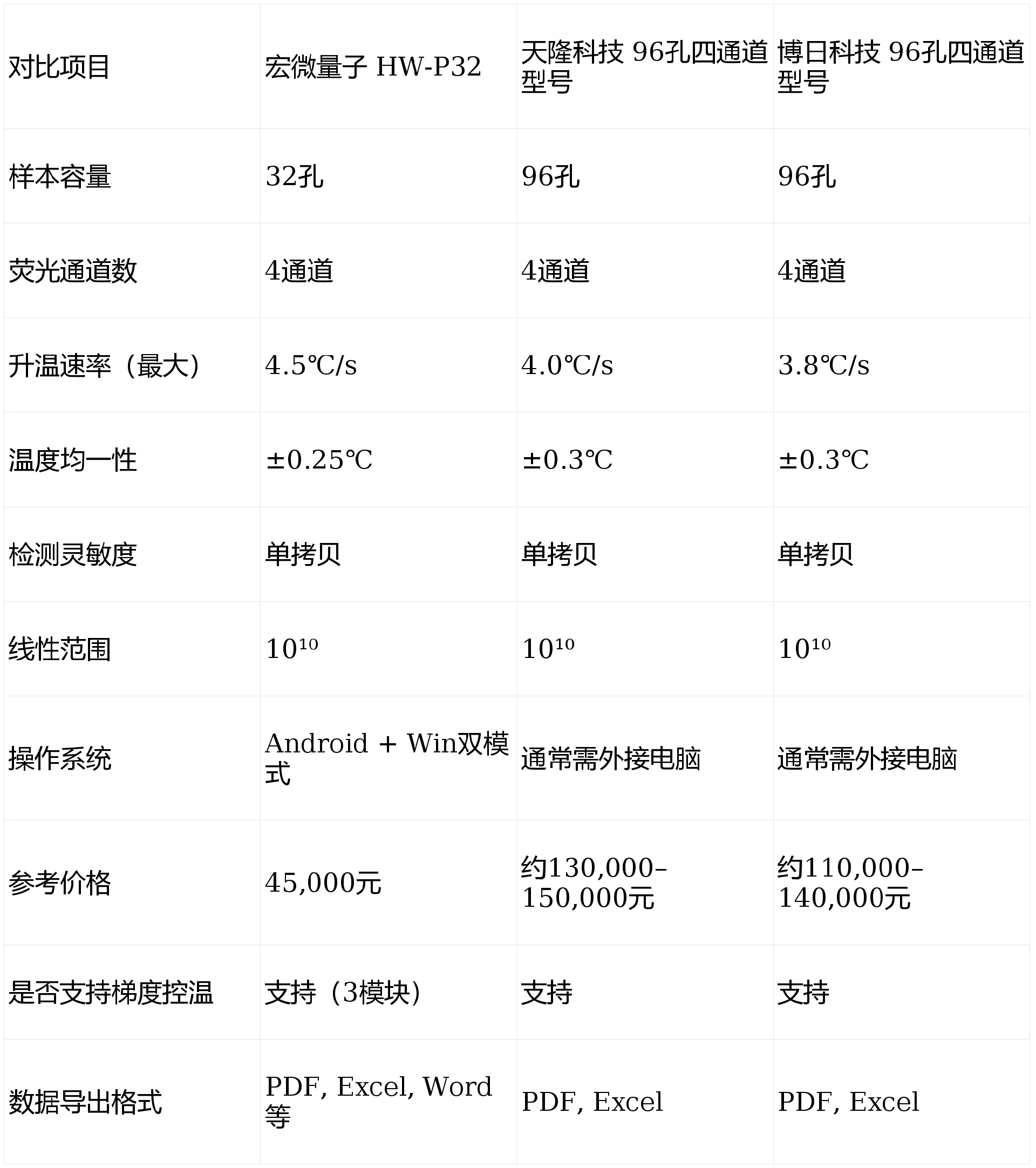 说明:表格以宏微量子HW-P32为例进行中端型号对比,其在温控均匀性、升降温速度及双模式操作方面表现较为突出。