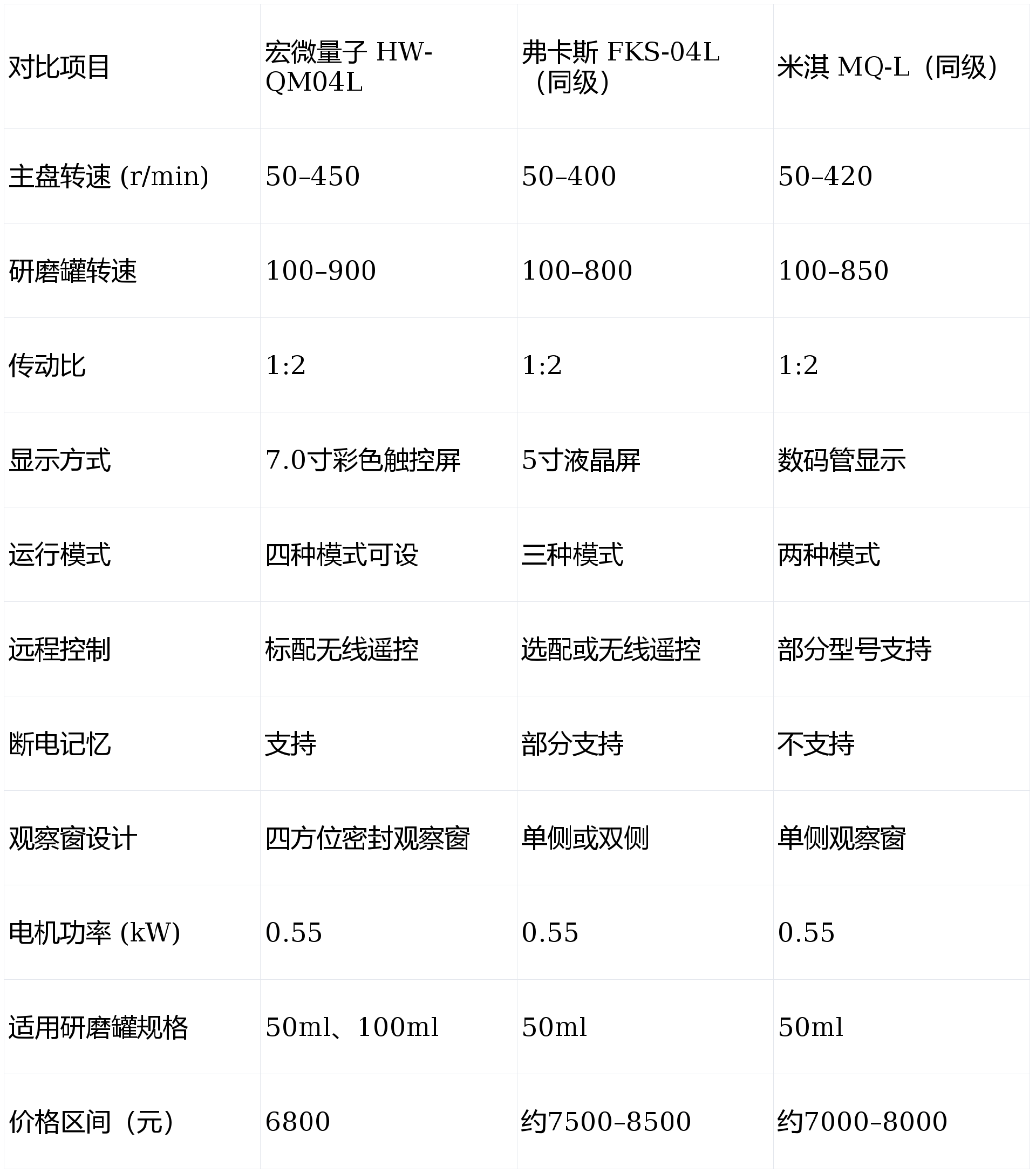 综合来看,宏微量子行星式球磨机在核心转速范围、智能控制功能、操作便利性等方面表现稳定,尤其在触控屏交互、多模式运行、断电记忆等实用功能上配置较为全面。在同容量机型中,其价格定位具有一定的竞争力,适合注重功能完整性与成本控制的用户。