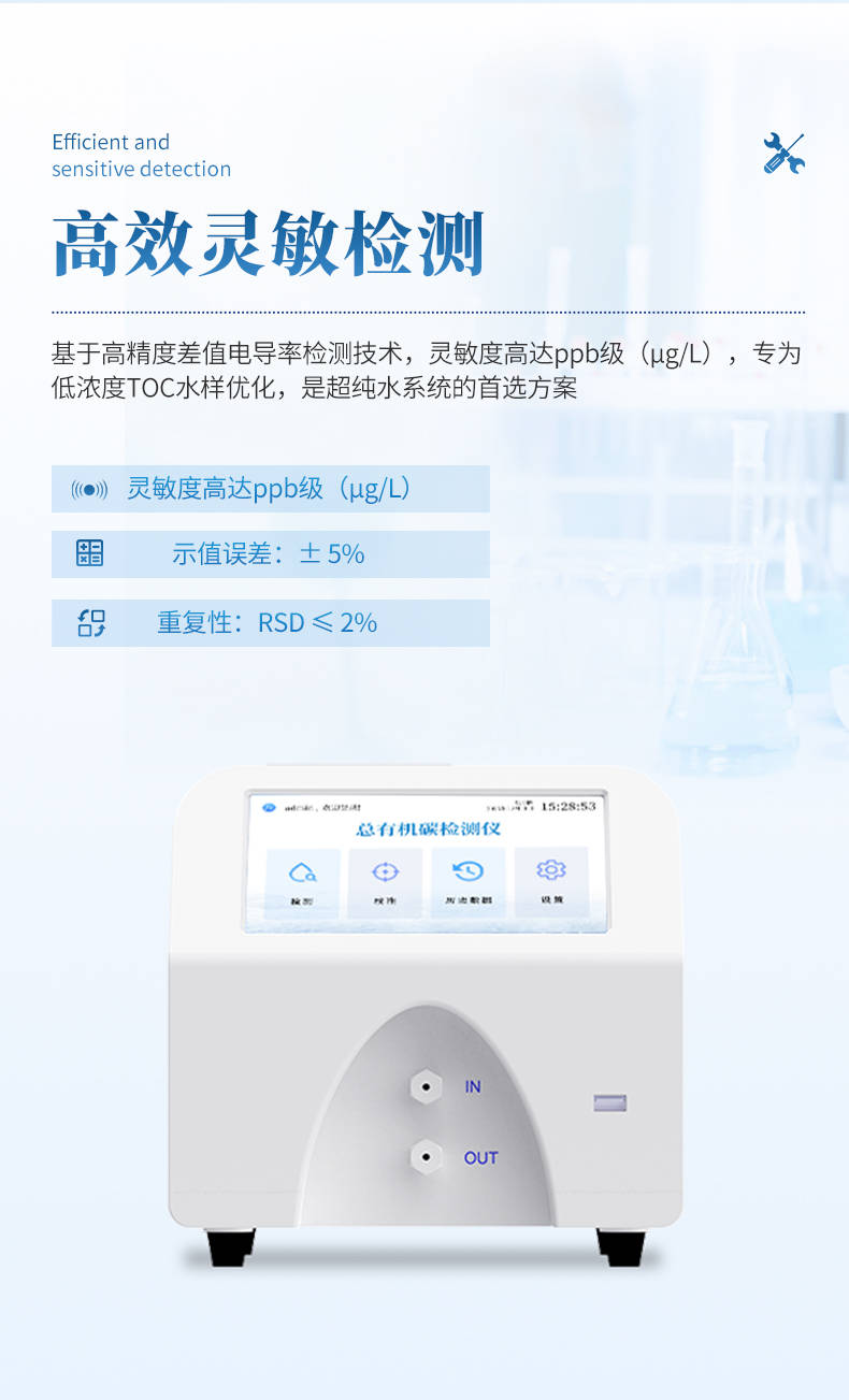 科研与化工: 作为实验室常规分析工具,用于材料、环境、化学等研究领域中高纯水的质量评估与有机物污染分析。