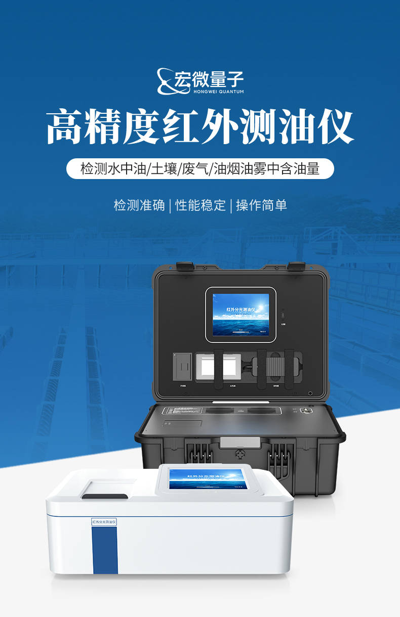 宏微量子红外分光测油仪系列产品严格遵循国家环境保护标准(HJ637-2018、HJ1051-2019、HJ1077-2019),采用红外分光光度法,适用于水质、土壤、废气中油类物质的定量分析。产品广泛应用于环境监测、石油化工、科研院校等领域,具有高灵敏度、高稳定性、智能化操作等优势。