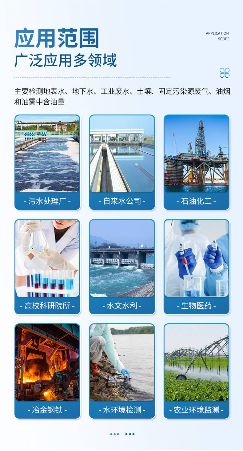 环境监测系统:地表水、地下水、工业废水、土壤中油类污染物的检测。