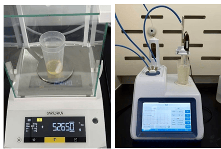 样品称取:准确称取制备好的牛油样品约5.0g(精确至0.001g)于滴定杯中。如样品在称 量过程中凝固,可适当温热滴定杯使其融化。