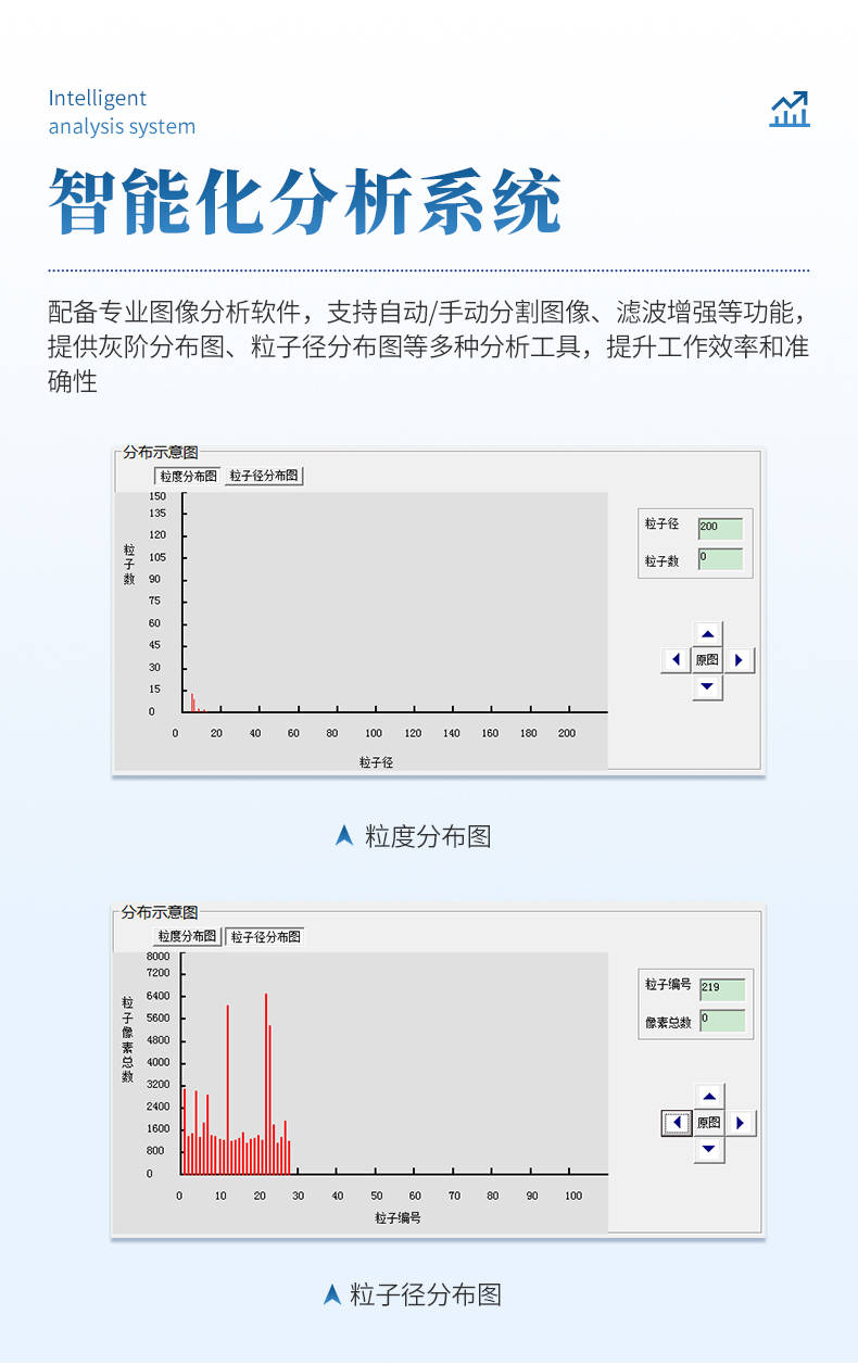软件支持自动与手动图像分割,提供灰阶分布图、粒径分布图、粒度分布图等多种分析工具,检测结果可自动生成报表并支持Excel导出。