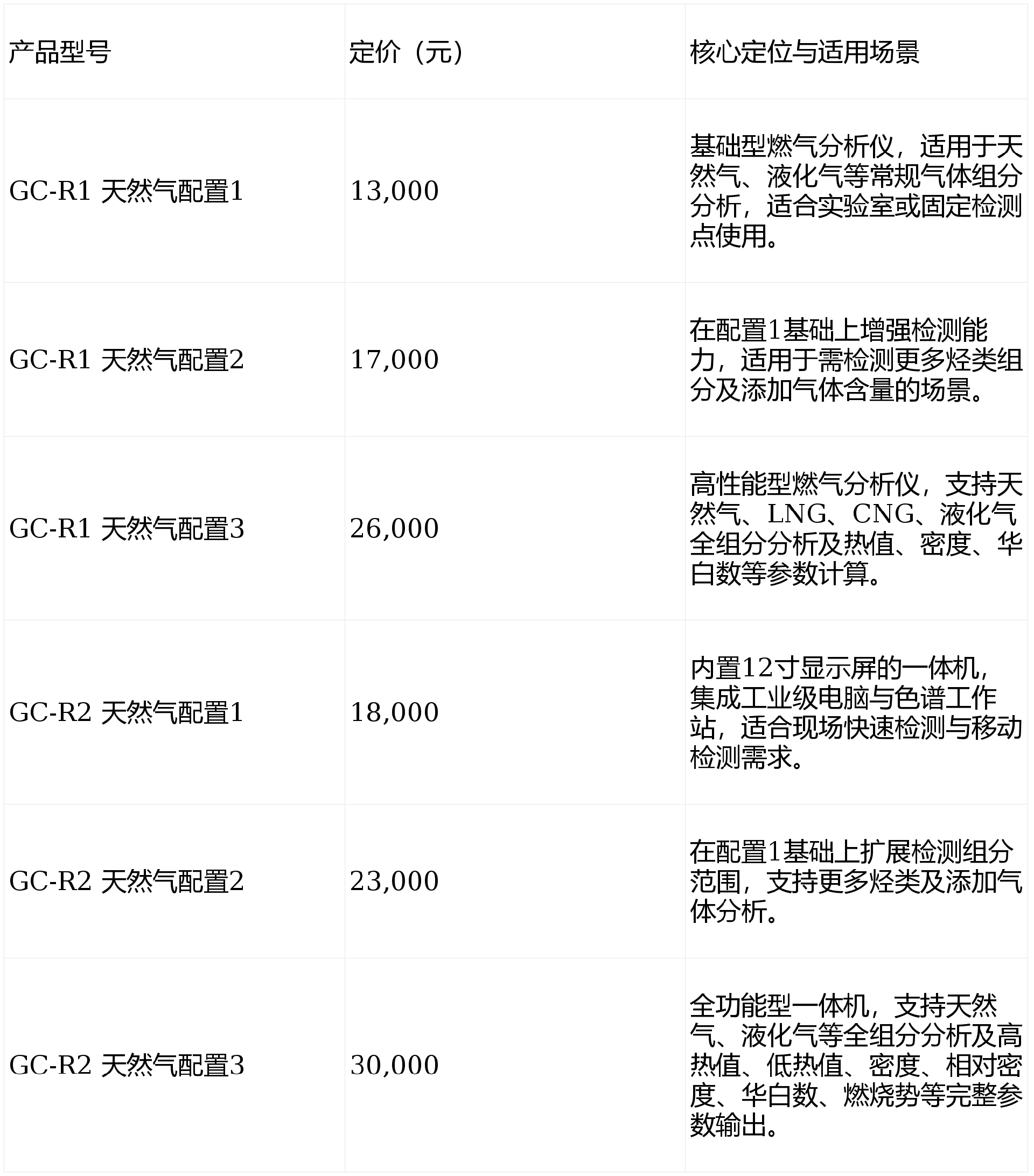 若需全面分析燃气组分、热值、密度、华白数等参数,推荐选择GC-R1 天然气配置3。