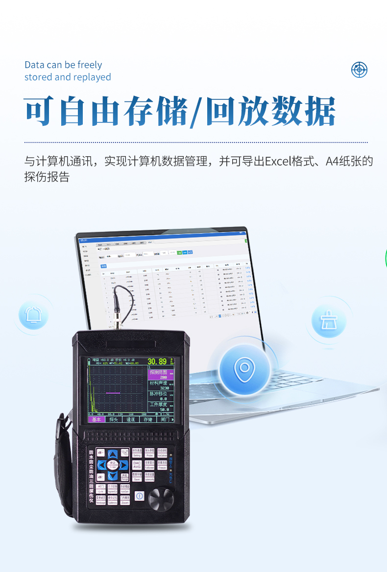 13、与计算机通讯,实现计算机数据管理,并可导出Excel格式、A4纸张的探伤报告;
