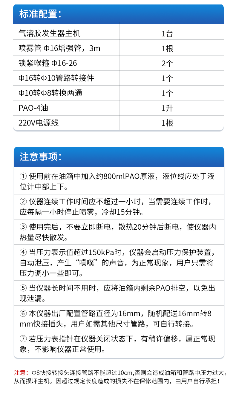 Φ8快接转接头连接管路不能超过10cm,否则会造成油箱和管路中压力过大,从而损坏主机。因超过规定长度造成的损失不在保修范围内,由用户自行承担!
