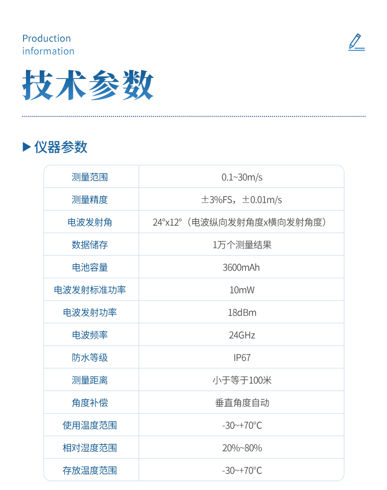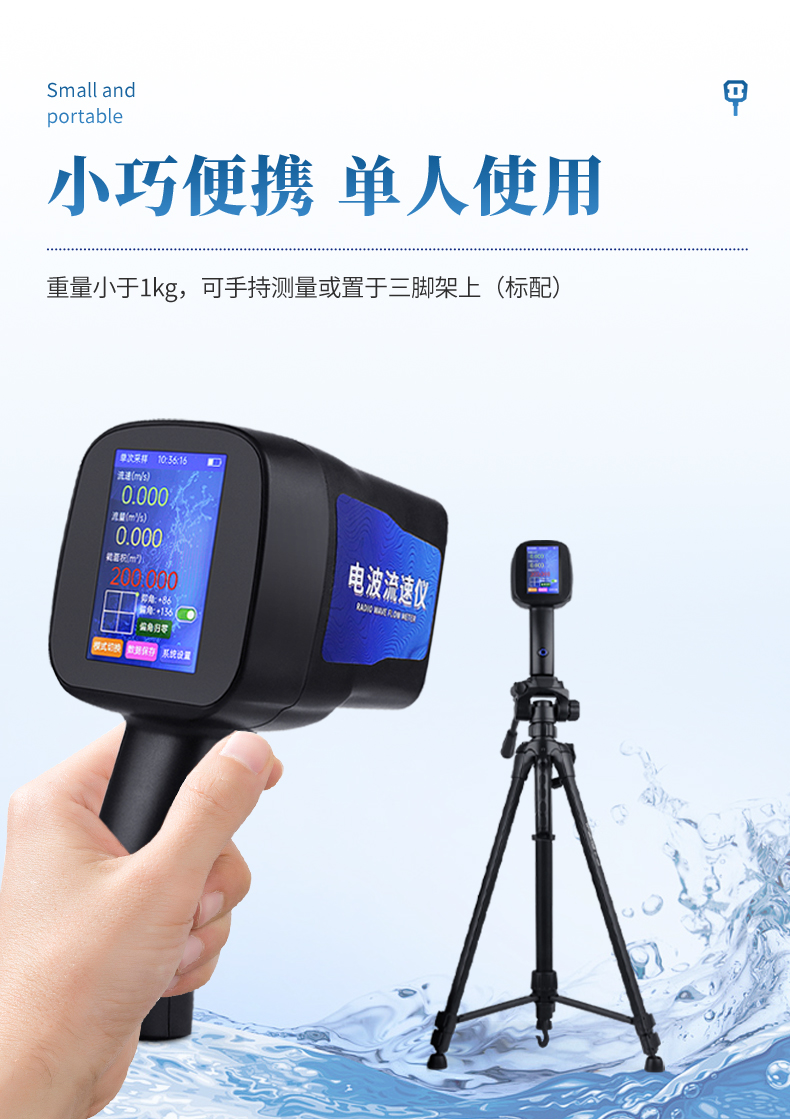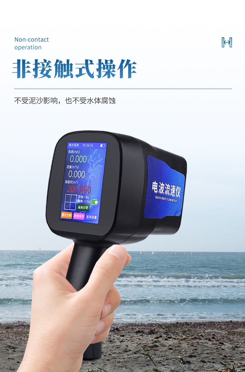 手持式电波(雷达)流速仪,该仪器采用K波段雷达对河流、污水、泥浆、海洋进行非接触式的流速测量。具有体积小巧、手持式操作、电池供电、使用简便的特点。使用中不受污水腐蚀、不受泥沙干扰,并可在小于等于100米的测量范围内进行非接触测量,确保了测量者的安全。仪器包括一个高敏感度的平面窄带雷达探头和角度计,无需任何设置,一键操作即可实现水平和垂直角度的自动校正和流速的修正测量,使用非常便捷。