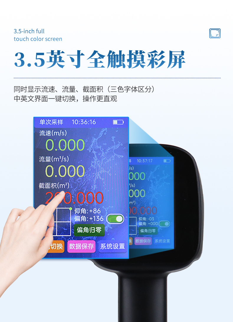 2.屏幕3.5英寸,全触摸操作,屏幕同时显示 流速、流量、截面积(三色字体显示);☆