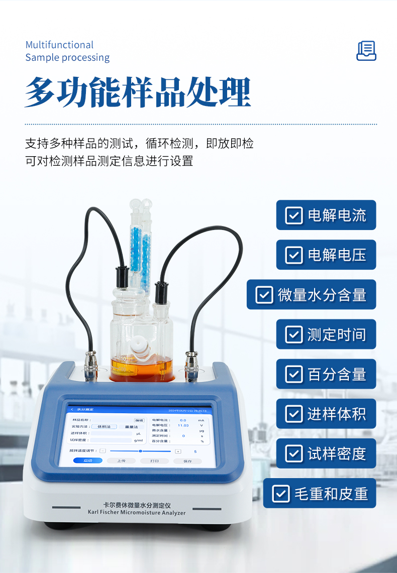 2.仪器具有试验结果存储、打印、计算功能;样品测定过程由仪器自动控制,搅拌、测定60秒左右自动完成,直接显示测定结果;全密封滴定池瓶,避免试剂与人接触,也避免环境湿度的影响;仪器中文液晶显示,并具有自动计算和打印功能,能打印出百分含量、样品编号、试验员、实验日期等内容;仪器准确度为:①水含量小于10微克水时,测量值误差小于2ug水;②水含量在10微克-1000微克水时,测量误差≤2ug水;③水含量在1000微克以上时,测量值误差≤0.2%(不含进样误差);