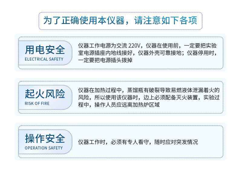 2.起火风险:仪器在加热过程中,蒸馏瓶有破裂导致易燃液体泄漏着火的风险,所以使用该仪器时,边上必须配备灭火装置,实验过程中,操作人员应远离加热炉区域。