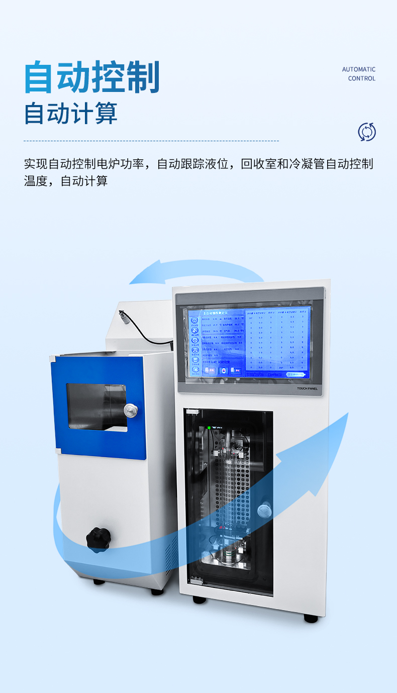 8.仪器实现自动控制电炉功率,自动跟踪液位,回收室和冷凝管自动控制温度,自动计算。