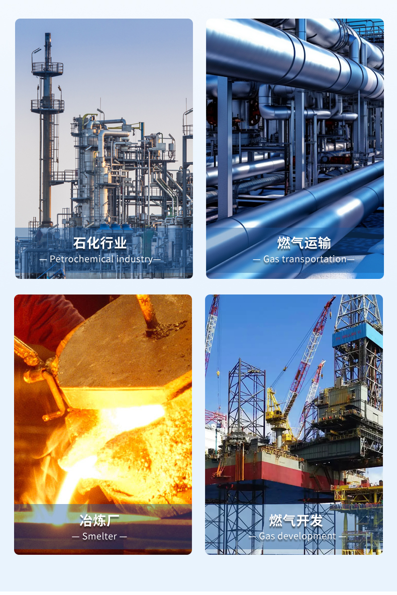 LPG LNG CNG 加气站 、 油田气 、 煤层气 、 矿井气 、 页岩 气 、燃气管道运输公司 、 燃气运输公司 、燃气储备站 、 煤改 气企业 、 LNG 点供 、 燃气具生产企业 、 石油炼化 、 焦化厂 、冶炼厂和供气站等众多行业。