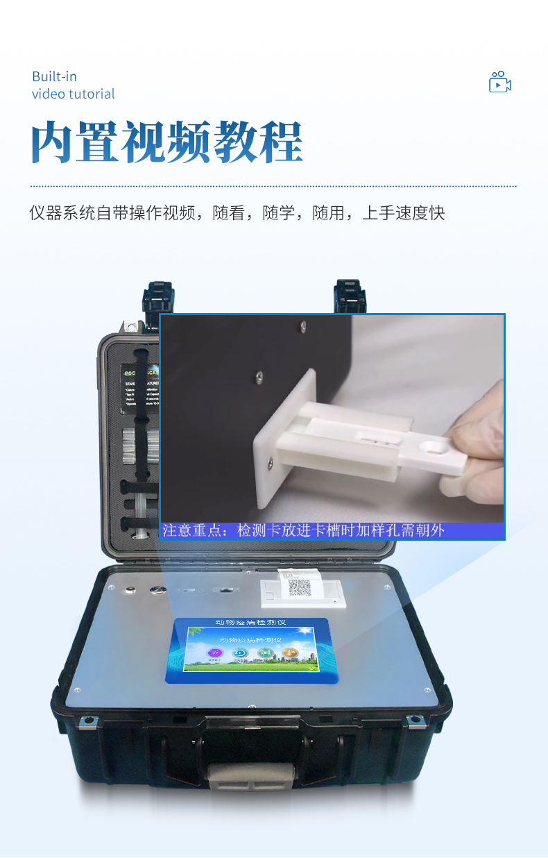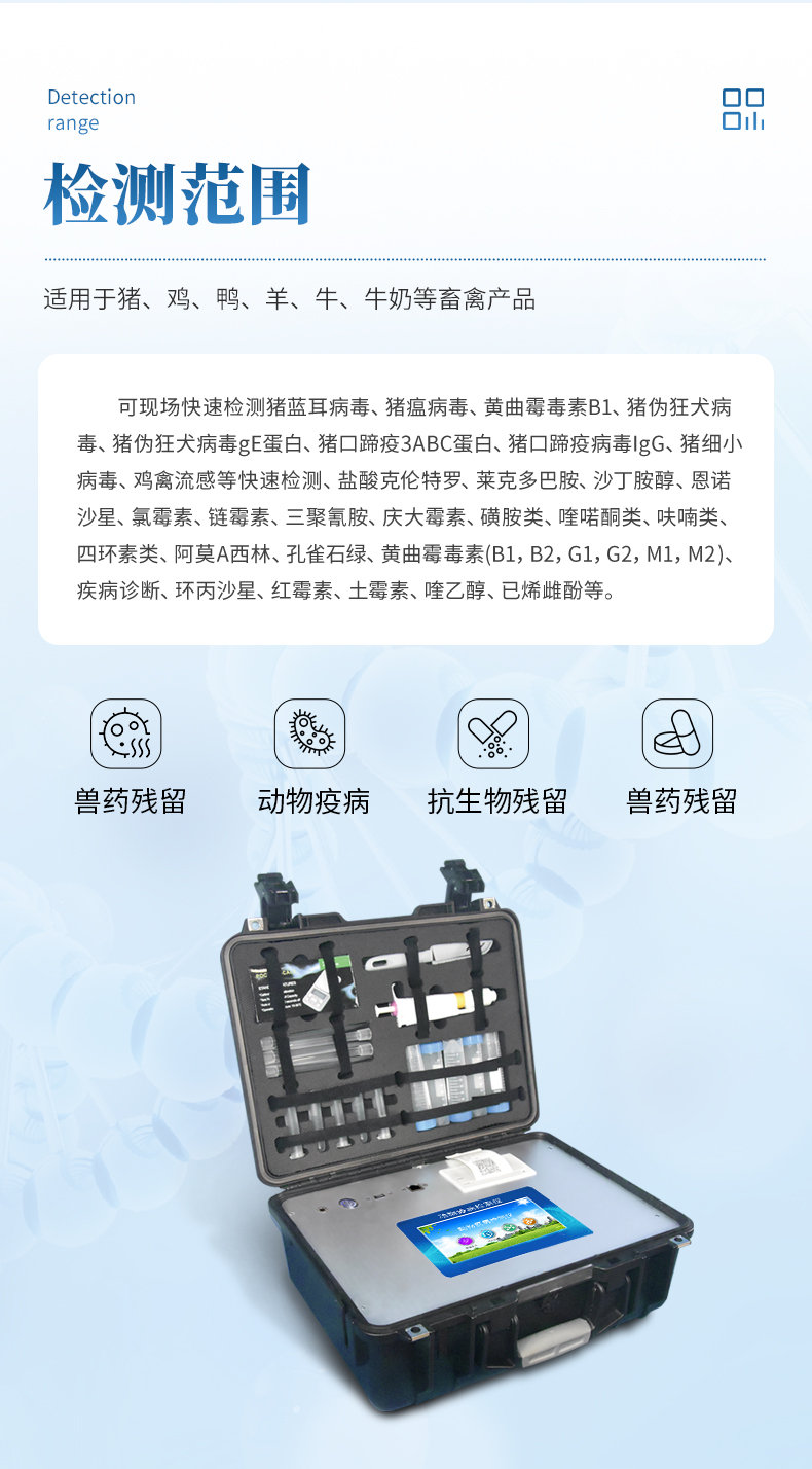 动物疫病诊断仪可现场快速检测猪蓝耳病毒、猪瘟病毒、黄曲霉毒素B1、猪伪狂犬病毒、猪伪狂犬病毒gE蛋白、猪口蹄疫3ABC蛋白、猪口蹄疫病毒IgG、猪细小病毒、鸡禽流感等快速检测、盐酸克伦特罗、莱克多巴胺、沙丁胺醇、恩诺沙星、氯霉素、链霉素、三聚氰胺、庆大霉素、磺胺类、喹喏酮类、呋喃类、四环素类、阿莫西林、孔雀石绿、黄曲霉毒素(B1,B2,G1,G2,M1,M2 )、疾病诊断、环丙沙星、红霉素、土霉素、喹乙醇、已烯雌酚等项目的定性检测。