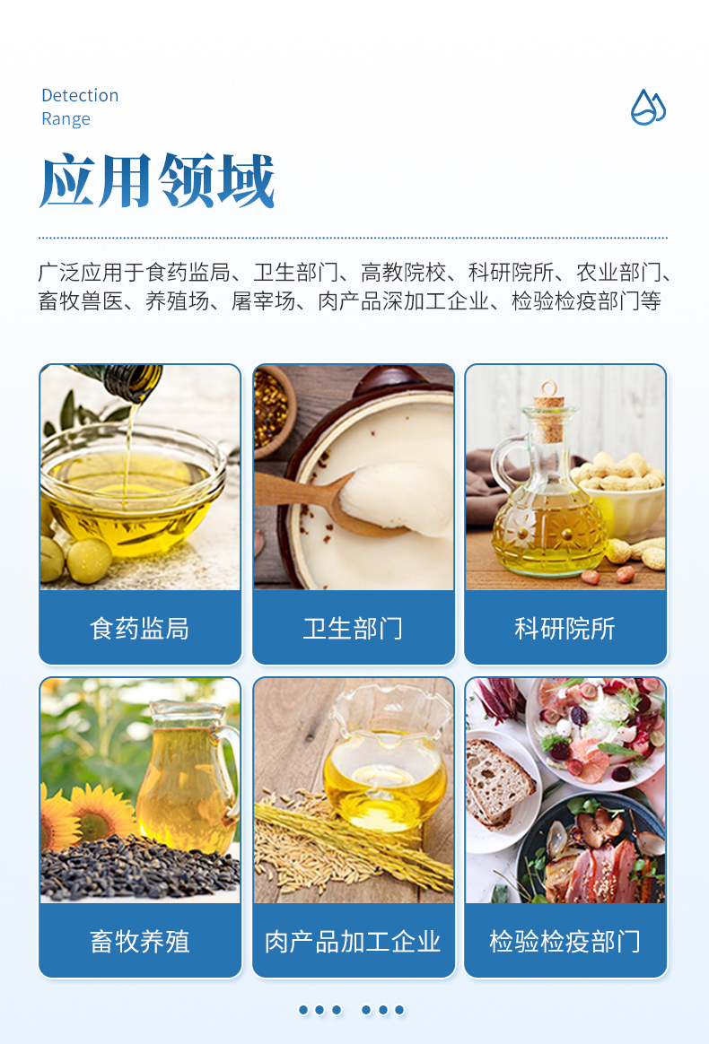 该动物疫病诊断仪适用于猪、鸡、鸭、羊、牛、牛奶等畜禽产品中动物疫病、兽药残留、有毒有害物质和抗生素残留的检测可广泛应用于食药监局、卫生部门、高教院校、科研院所、农业部门、畜牧兽医、养殖场、屠宰场、食品肉产品深加工企业、检验检疫部门等单位使用。