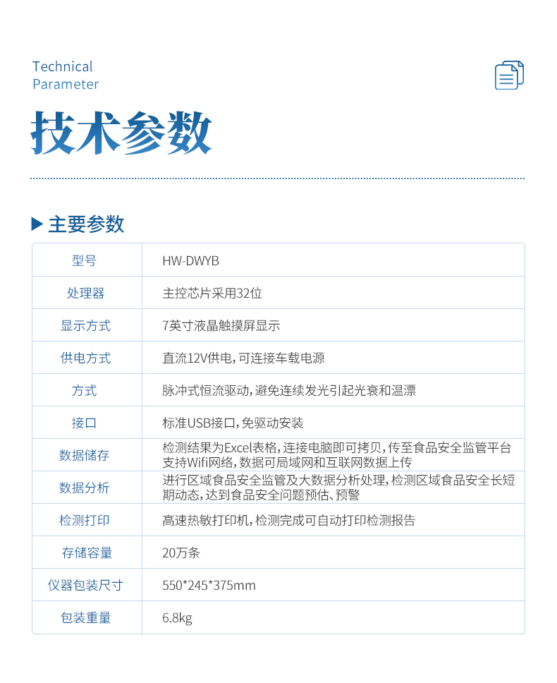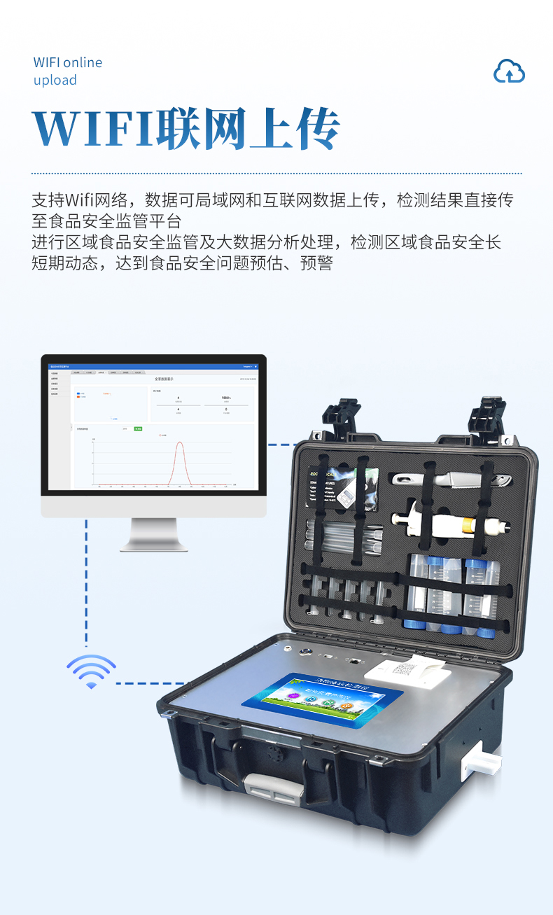 13、支持Wifi网络,数据可局域网和互联网数据上传,检测结果直接传至食品安全监管平台。进行区域食品安全监管及大数据分析处理,检测区域食品安全长短期动态,达到食品安全问题预估、预警