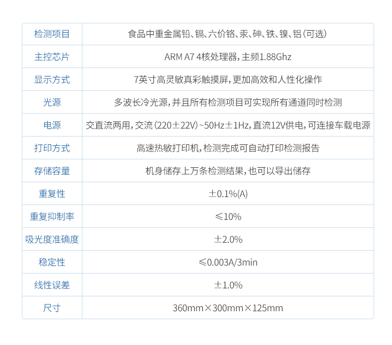 重金属检测仪可广泛应用于大米、粮谷、果品、蔬菜、药材、水质、水产品中重金属铅、镉、六价铬、汞、砷、铁、镍、铝(任选5项)的快速检测,检测项目可根据客户的需求定制。