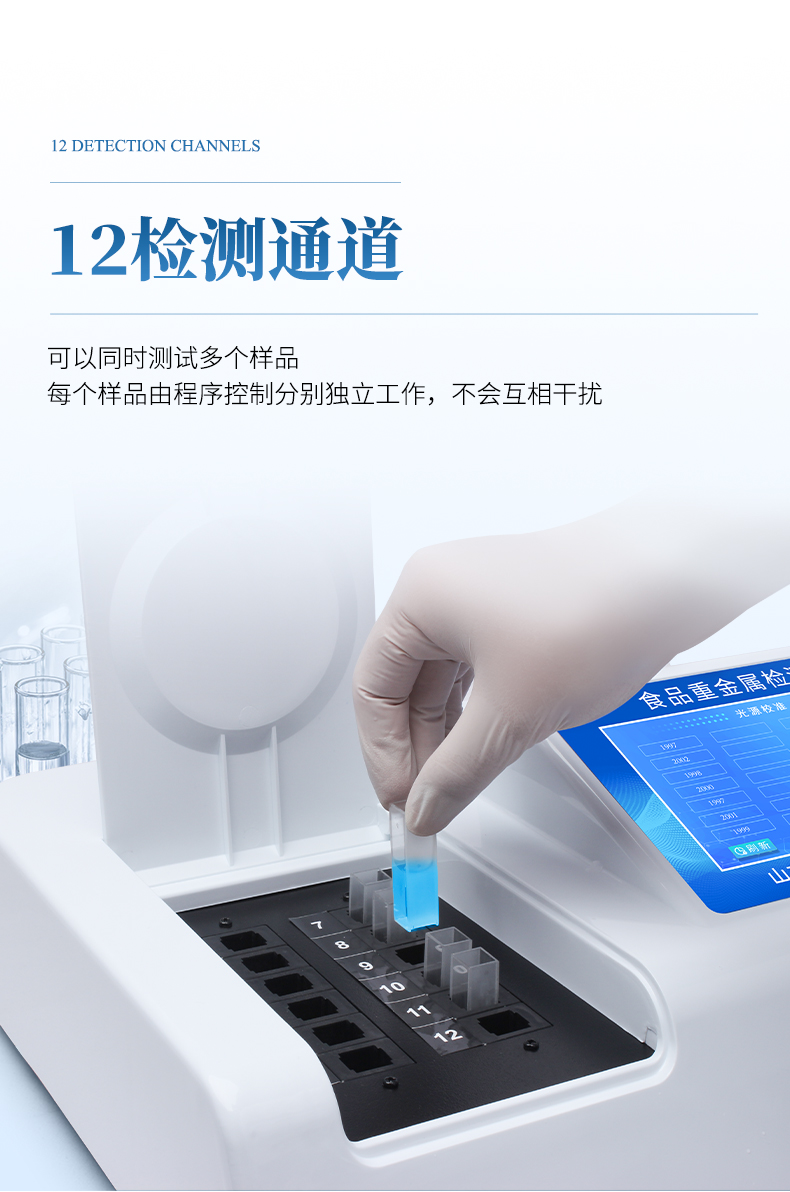 6、检测通道:12检测通道,可以同时测试多个样品,每个样品由程序控制分别独立工作,不会互相干扰。