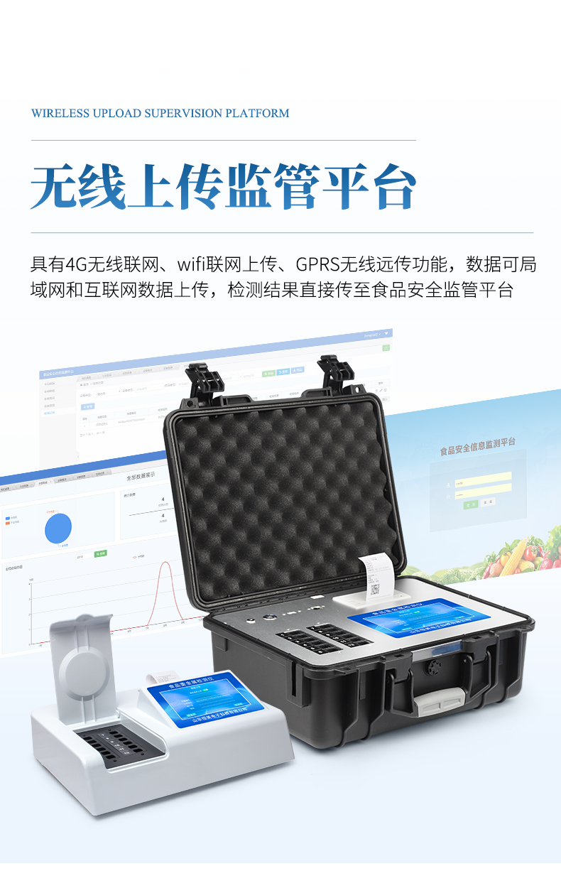 9、机身储存上万条检测结果,也可以导出储存,另配备USB接口,方便U盘快速拷贝数据。 10、支持Wifi网络,数据可局域网和互联网数据上传,检测结果直接传至食品安全监管平台。进行区域食品安全监管及大数据分析处理,检测区域食品安全长短期动态,达到食品安全问题预估、预警