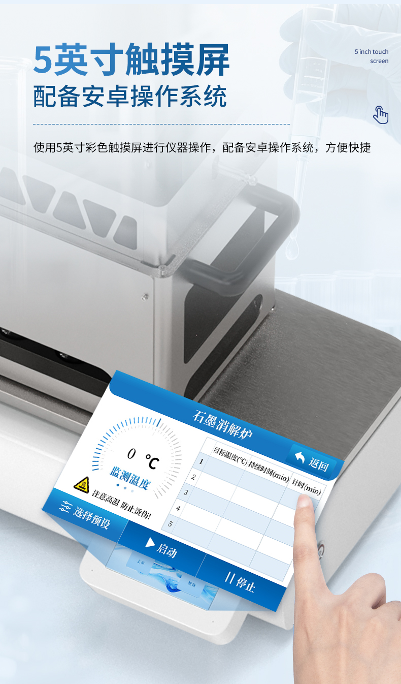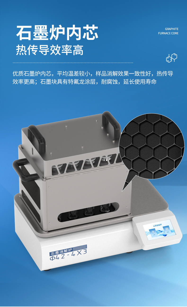 采用优质石墨炉内芯,平均温差较小,样品消解效果一致性好,热传导效率更高。石墨块具有特氟龙涂层,耐腐蚀,延长使用寿命。