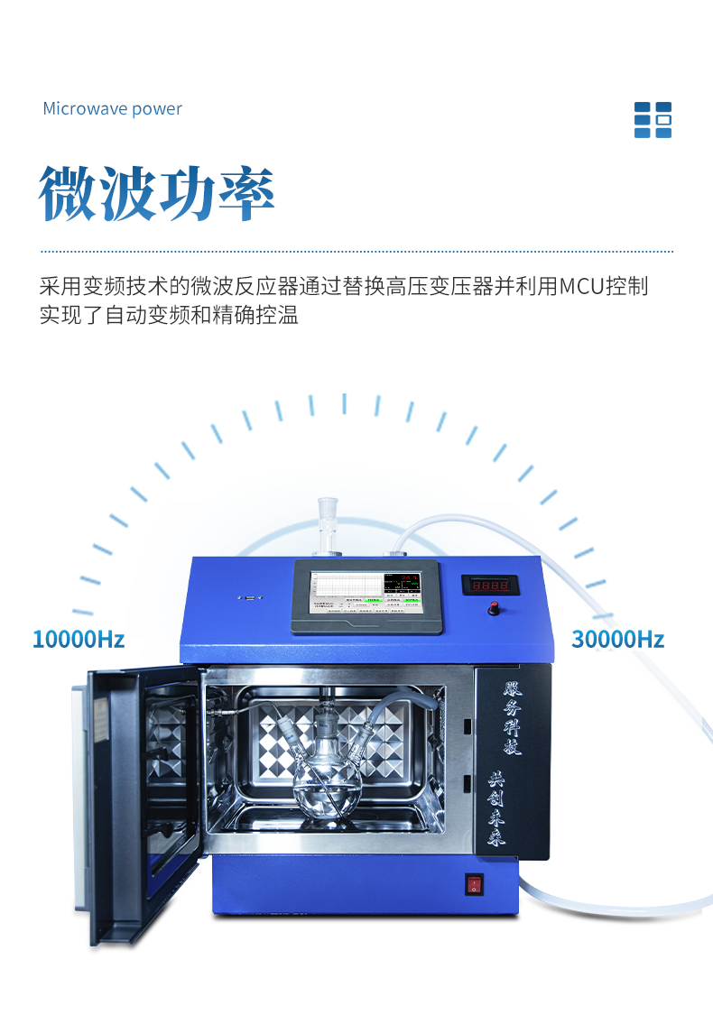 采用最新变频技术,通过变频器将50Hz工频转换为10000~30000Hz可变频率,取代了传统微波反应器使用的高压变压器,完美解决了传统微波反应器精确控温时,高压变压器受尖峰脉冲的冲击,造成变压器频繁损坏的技术缺陷。MCU根据Pt100传感器实时检测到的温度变化数据、反应物质极性、热容变化、反应时间等数学模型的变化条件,自适应PID调节,自动变频控制微波输出功率,从而精确控温。