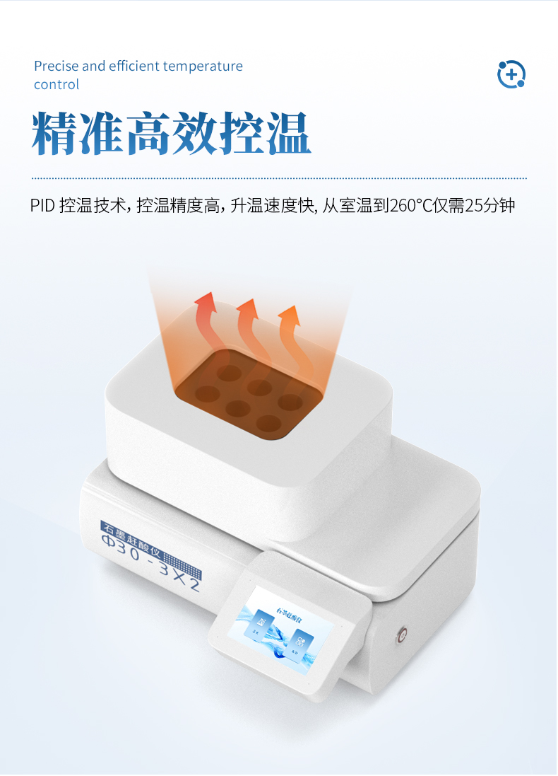 采用PID 控温技术,控温精度高,升温速度快, 从室温到260℃仅需25分钟。