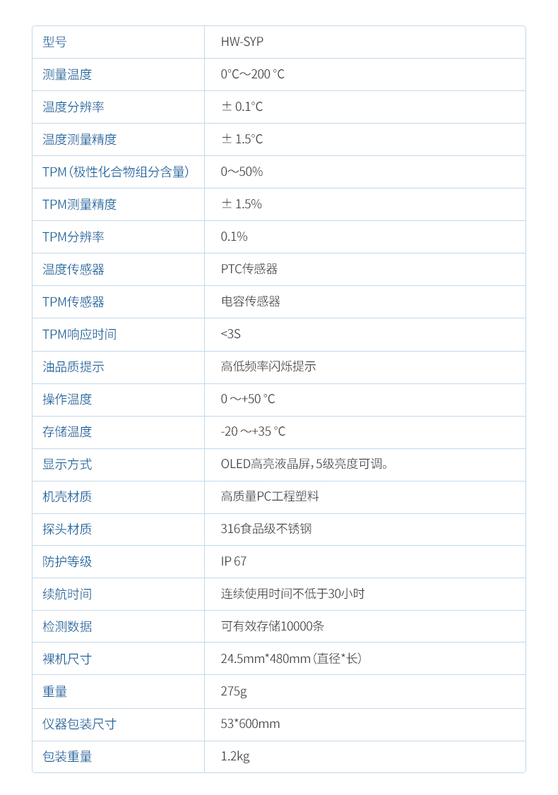 食用油脂是人们摄取能量和营养的重要来源,是加工食品的重要原料。油炸食品以其特有风味广受消费者喜欢。用于煎炸的食用油在高温煎炸过程中发生一系列的物理、化学变化,这些变化会生成对身体健康有害的物质。目前,煎炸食用油的传统检测方法多为化学方法,这些方法必须在实验室内由专业人员操作,费时费力,化学试剂的使用可能会伤害检测人员健康,且化学废剂污染了环境。SYP是一种快速,安全,高效食用油品质检测仪,能够快速检测食用油中的极性化合物组分(TPM)含量。本产品能够在油温较高的环境下使用,适用于各种煎炸的食用油品质检验。