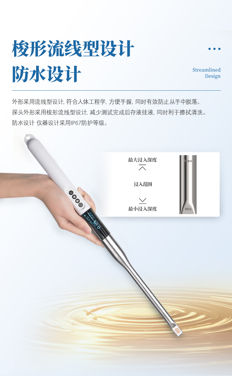 ■探头外形采用梭形流线型设计,减少测试完成后存液挂液,同时利于擦拭清洗。