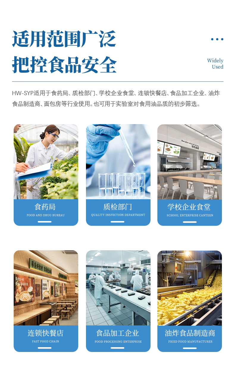 SYP工业版特别适合食药局、质检部门、学校企业食堂、连锁快餐店、食品加工企业、油炸食品制造商、面包房等行业使用,也可以用于实验室对食用油品质的初步筛选,对劣质油、地沟油的鉴别等。能为您达到检验油品品质、节省食用油、保证产品的质量、保证食品安全的目的。