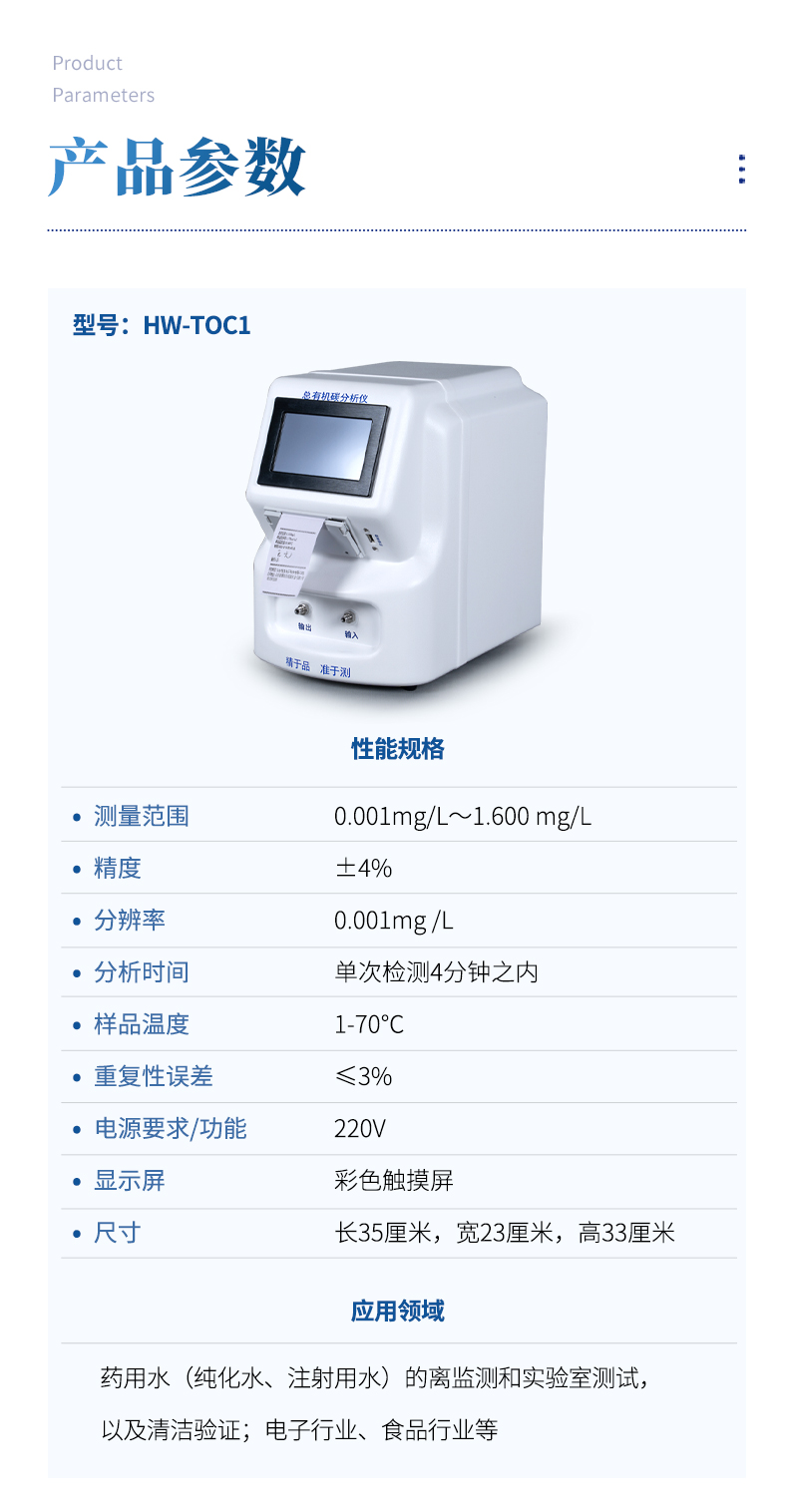 总有机碳分析仪是公司自主研发的高精度总有机碳分析仪器。产品使用电导率差值检测技术,检测精度高,响应时间短。产品符合国家法规和标准,可满足制药用水、注射用水、超纯水和去离子水的在线及离线的检测要求。